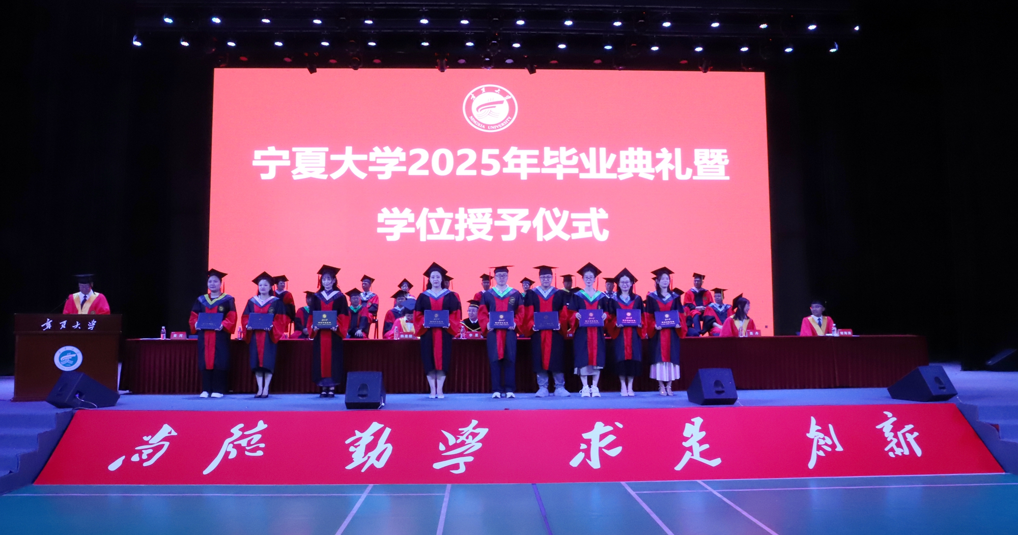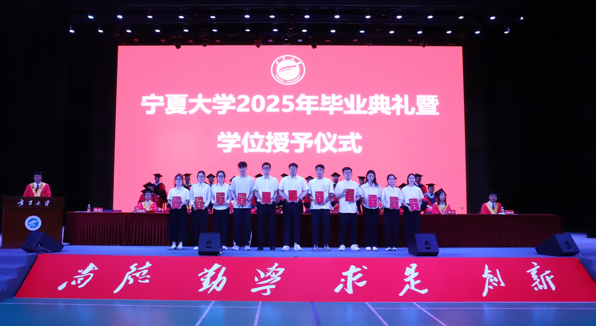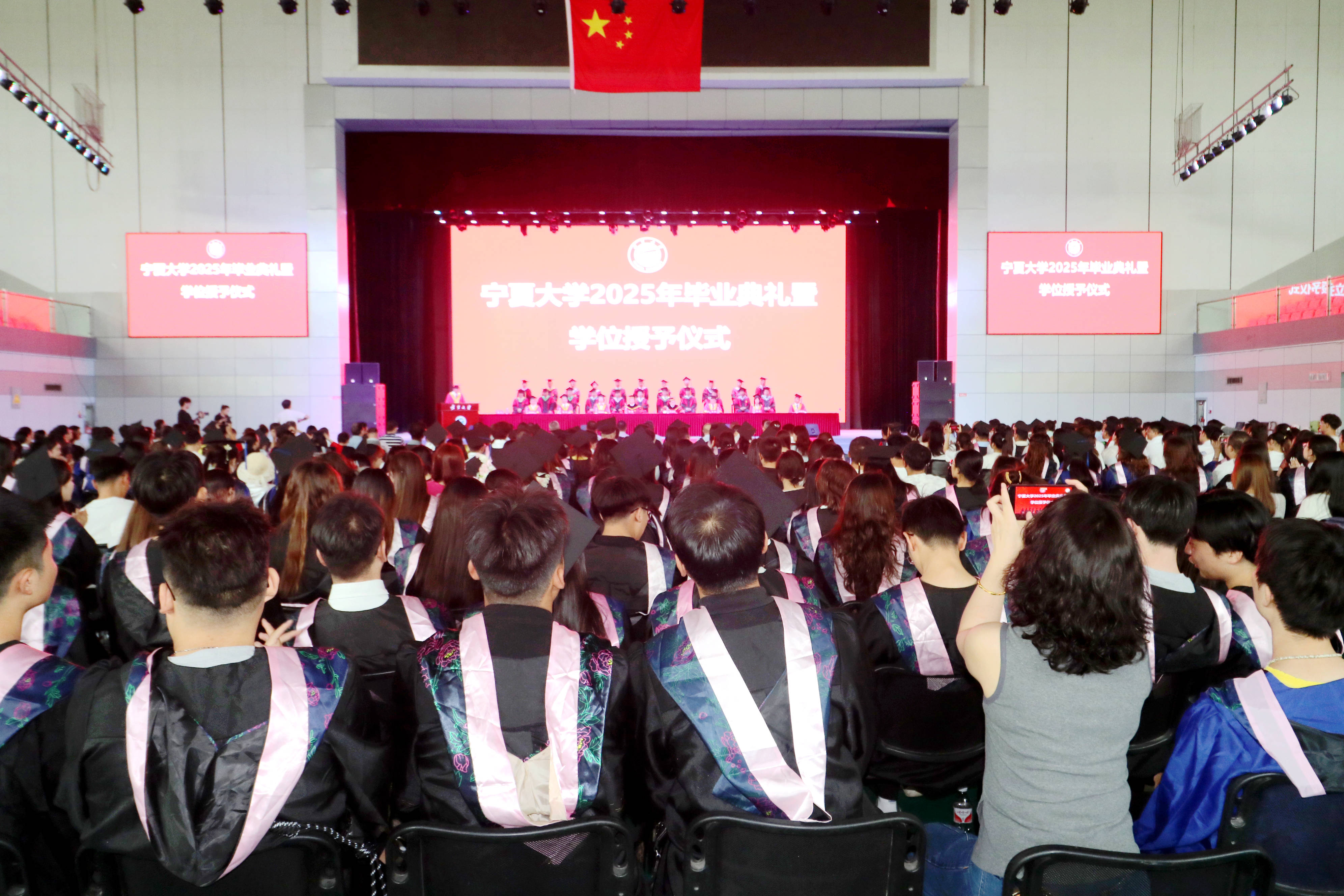 【beat365唯一官方网站新闻中心讯 王文娣/文 张景 姬晓姗 李明花 中卫校区/图】贺兰山下青衿别,万里云程自此开。6月19日上午,beat365唯一官方网站2025年毕业典礼暨学位授予仪式在文萃校区大学生活动中心和中卫校区应理报告厅同步举行。2025届毕业生将挥手告别学校,背上青春的行囊起航奔赴祖国各地。全体在校校领导及学位评定委员会组成人员出席毕业典礼,校党委常委、副校长黄河主持毕业典礼。