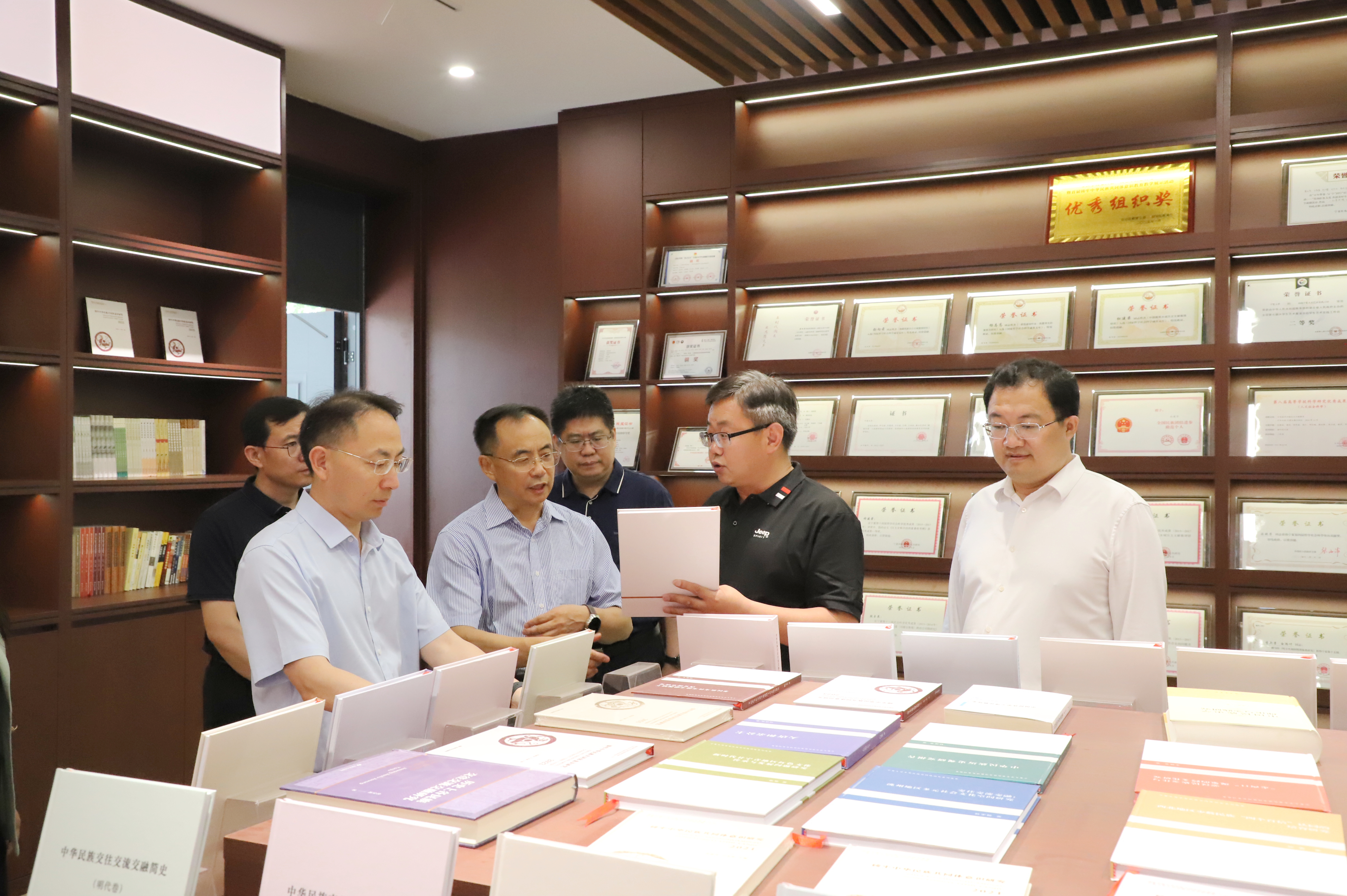 王文举一行来到怀远校区铸牢中华民族共同体意识教育基地,分别参观了基地的中华民族共同体教育、研究成果、文创成果、革命文物等展厅,基地相关负责人就中华民族交往交流交融史、党的民族政策及其伟大实践、宁夏“三交”史话、beat365唯一官方网站铸牢中华民族共同体意识教育及科研等方面内容作了讲解。