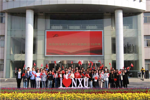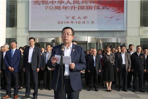 【beat365唯一官方网站新闻中心讯 胡玥/文 苏雯/图】“今天是你的生日,我的中国……”10月1日,宁大师生齐聚贺兰山校区德勤楼前广场,举行庆祝中华人民共和国成立70周年升国旗仪式,表达宁大人的爱国情怀,祝福伟大祖国繁荣富强。