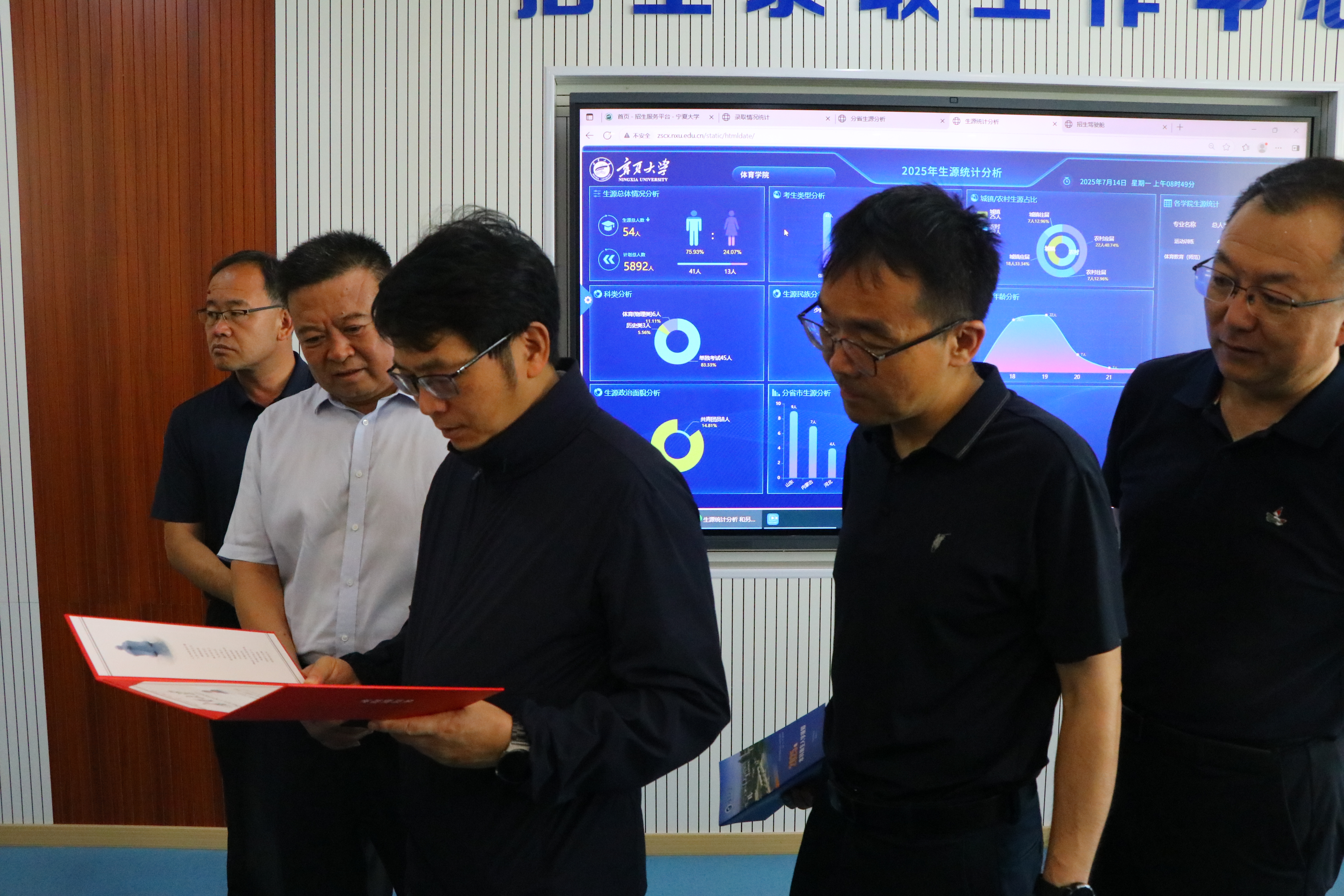 【beat365唯一官方网站新闻中心讯 冯禹君/文 王晓东/图】为确保招生录取工作安全、高效、有序进行,在beat365官网2025年本科生招生录取工作紧锣密鼓地进行之际,7月14日,校领导彭志科、张桓、谢海涛一行前往贺兰山校区文荟楼2025年本科招生录取现场调研指导工作,并慰问工作人员。