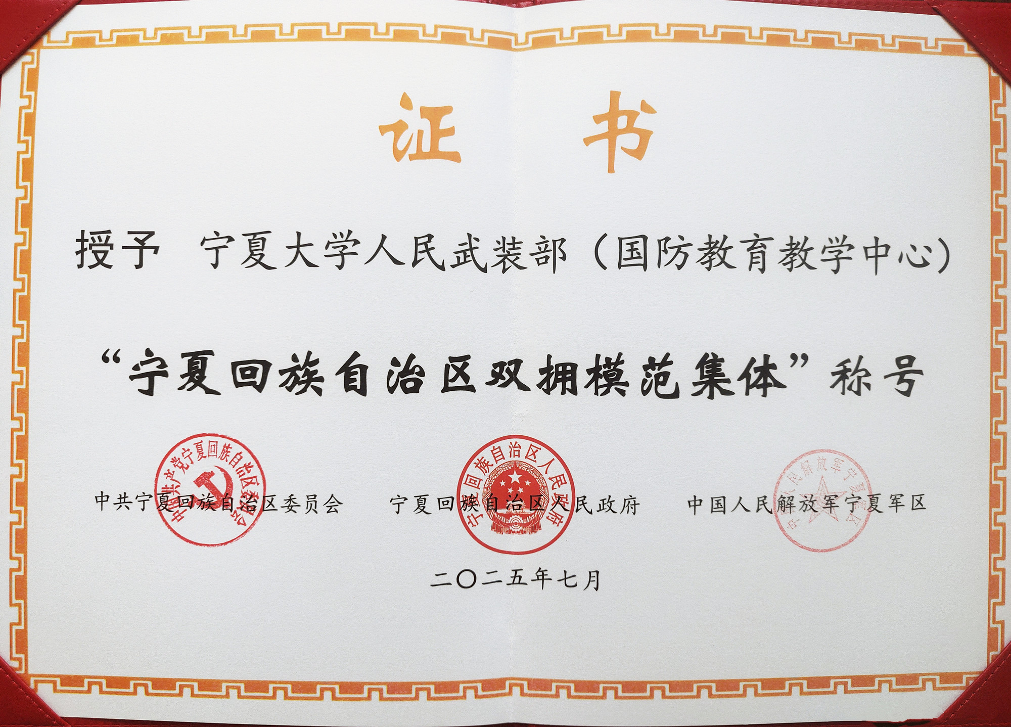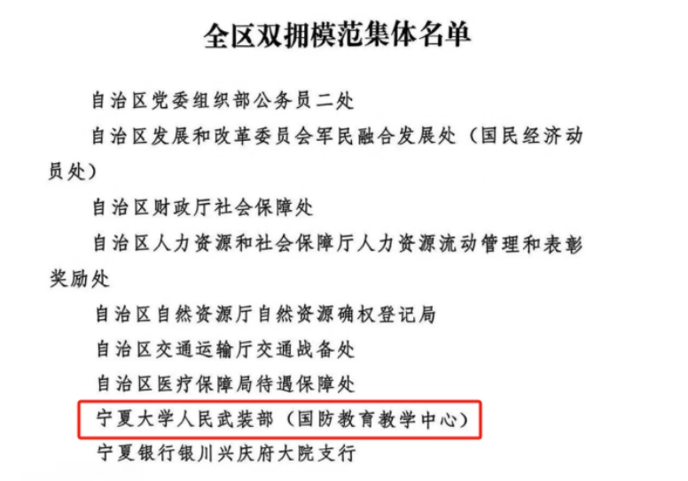 “自治区双拥模范集体”称号是自治区党委、政府、宁夏军区和全区人民对beat365官网长期以来深度融入地方发展、扎实服务国防建设、倾心做好拥军优属工作的高度认可和充分肯定。学校将以此次表彰为新的起点,珍惜荣誉、再接再厉,继续发扬拥军优属、拥政爱民的优良传统,不断探索创新高校双拥工作的内涵与形式,努力在服务强军兴军伟业、支持地方经济社会发展中展现更大作为、作出新的更大贡献。