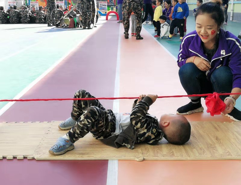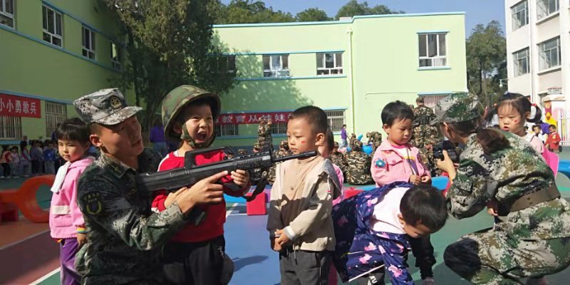 志愿服务活动中,2019级军训学生代表向幼儿园师生展示了队列基本动作,同学们整齐划一,令行禁止的队列动作赢得了小朋友的热烈掌声;军迷之家”的退伍大学生给小朋友们展示了95式自动步枪、56式半自动步枪、警棍等军械的组织结构、基本操作方法等内容,并邀请有兴趣的小朋友一起操作演练;参加活动的老师们带领小朋友们一起玩了有“兵味”的小游戏。