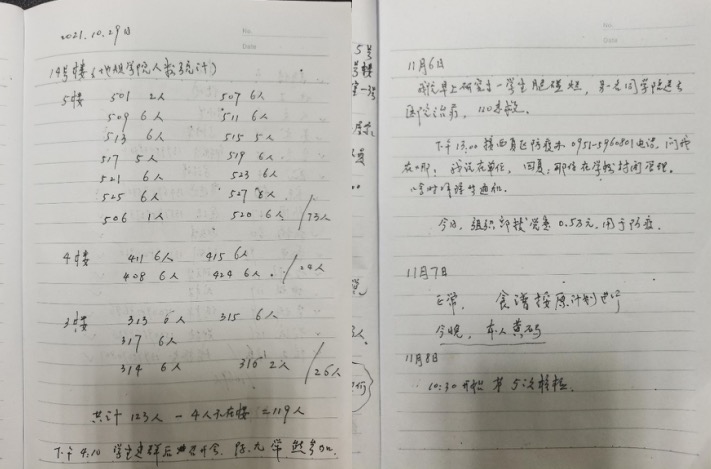 “10月30日,同学反映午餐米饭有些少”,“11月6日我院一名研究生腿磕烂,另一名同学陪送医院治疗,120急救”……陈军胜的记录本上密密麻麻地写满了每天的工作安排,每一个字都透露着他对待学生工作的细心,彰显出一位疫情防控一线工作者的坚守。在谈及疫情结束后最想做的事,他回答到:“这个问题我也在思考,疫情结束后,我最想做的是什么事?当然是恢复正常的教学秩序,看到我的同事和学生,听到他们可爱可亲的声音。第二,我最想做的一件事,就是保存好我的值班记录,留作纪念。”(学生记者:林烨 崔秀玲 何佳辉 张佩茹)