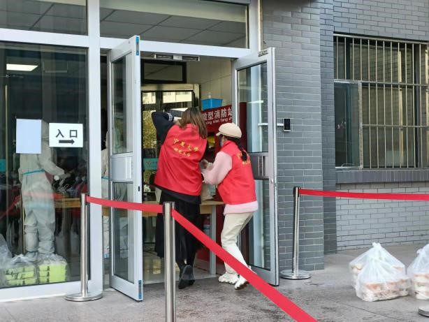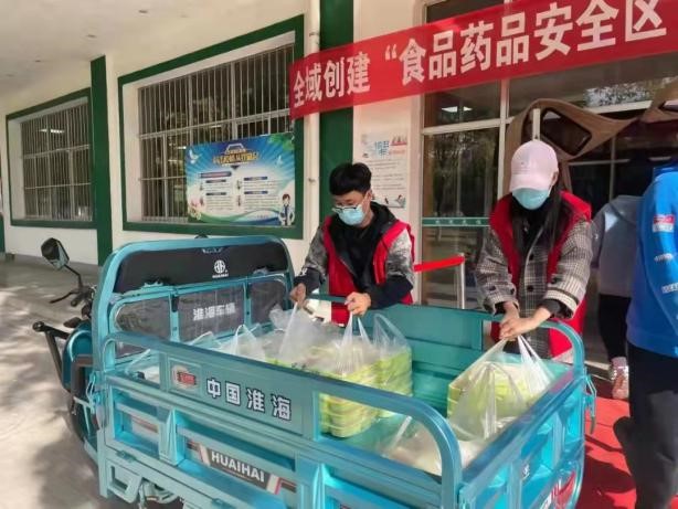 与此同时,文萃校区和怀远校区的送餐派送活动也在紧张有序地进行着。志愿者们虽然被口罩遮住了面庞,但依旧能从他们的一举一动中猜测出他们内心想要把饭菜赶忙送到公寓楼里的迫切。