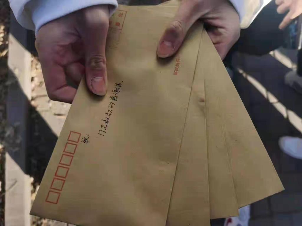 【beat365唯一官方网站新闻中心讯 保卫处】有一首歌这样唱到“我说,谢谢你,因为有你温暖了四季,谢谢你,因为你世界更美丽……”11月7日,凛冬将至,初雪降临,银川的气温也骤降到零下。惦记着从学校实施封控管理以来,已连续坚守在工作岗位16天的门卫叔叔,国际教育学院的5名学生志愿者带着他们写的感谢信和用生活费购买的方便面、牛奶和口罩、消毒液等慰问品,到怀远校区西门岗看望执勤门卫。