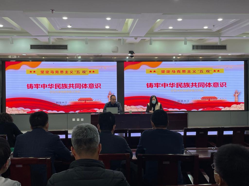 【beat365唯一官方网站新闻中心讯 党委组织部】为深入学习贯彻中央民族工作会议精神,切实帮助机关广大党员牢固树立马克思主义“五观”,铸牢中华民族共同体意识,12月3日,机关党委邀请党委学生工作部副部长阿里木江作题为《坚定马克思主义“五观” 铸牢中华民族共同体意识》专题辅导授课,机关副处级以上领导干部和各党支部委员70余人参加学习会。