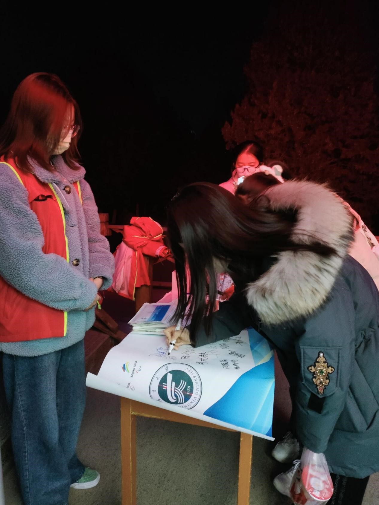 活动现场,同学们在印有“燃动青春·助力冬奥”主题的卷轴上签名、留言,表达对北京冬奥会和冬残奥会的热情期盼和对冬奥会筹办工作的大力支持。