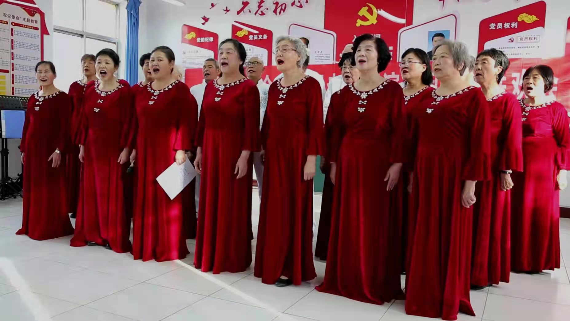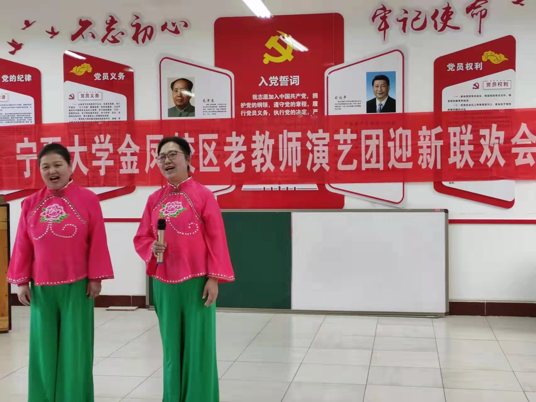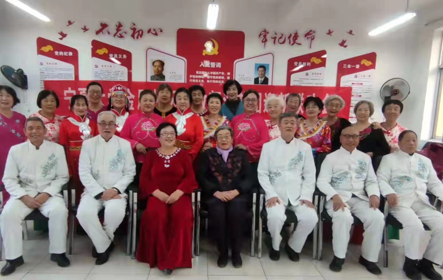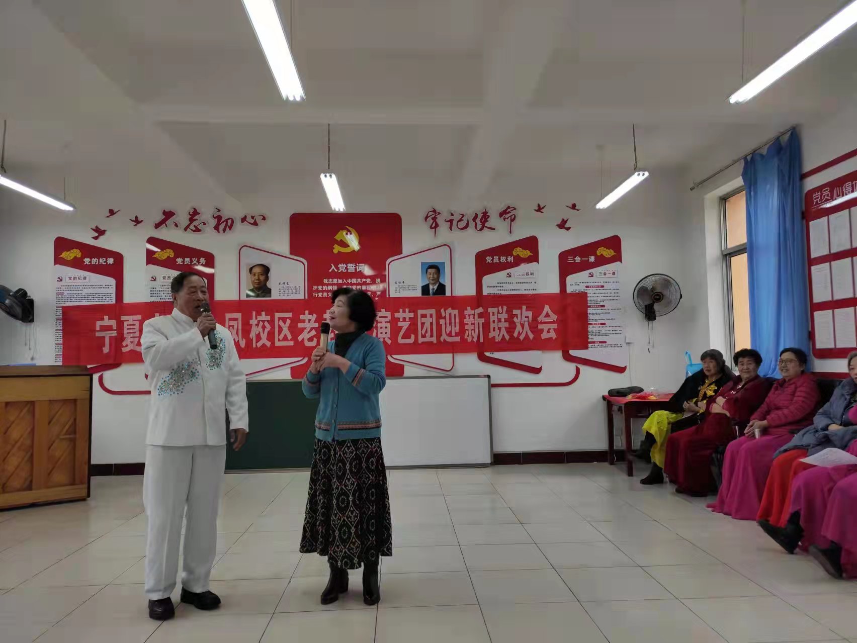 在吴爱霞老师指挥,84岁老党员华觉勤老师钢琴伴奏的《共和国之恋》《江山》大合唱中拉开联谊会帷幕。77岁老党员刘树珊老师的长诗朗诵《银光闪耀的志愿者》;五人男声小合唱《战士为国守安祥》;喜庆的舞蹈《最美花舞人间》;二人唱《好人多》《草原夜色美》《驼铃》;夫妻对唱《遊牧时光》;女声小合唱《小草》及独唱《革命人永远是年轻》《少年壮志不言愁》《一壶老酒》《知音》《草原绿了》将演唱会推向了高潮。联谊节目还增添了老年大学课程学习成果展示内容:八人诗歌朗诵《诗意中国》;葫芦丝独奏《映山红》和尤克里里弹奏《欢乐颂》。