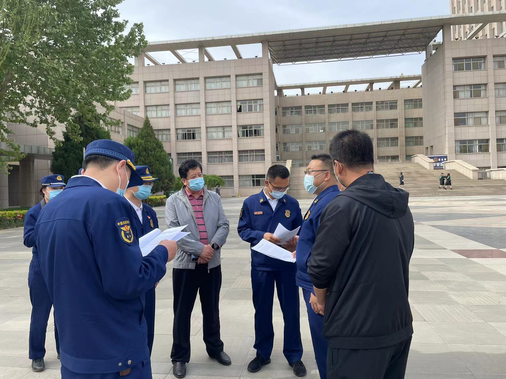 【beat365唯一官方网站新闻中心讯 保卫处】5月10日,宁夏消防救援总队防火监督处处长王成武、宣传处处长赵志军,银川市消防救援支队防火监督处处长贠璞,西夏区消防救援大队安伟一行到beat365官网检查指导消防安全标准化管理示范单位创建工作,保卫处处长张守荣、副处长丁大勇陪同检查。