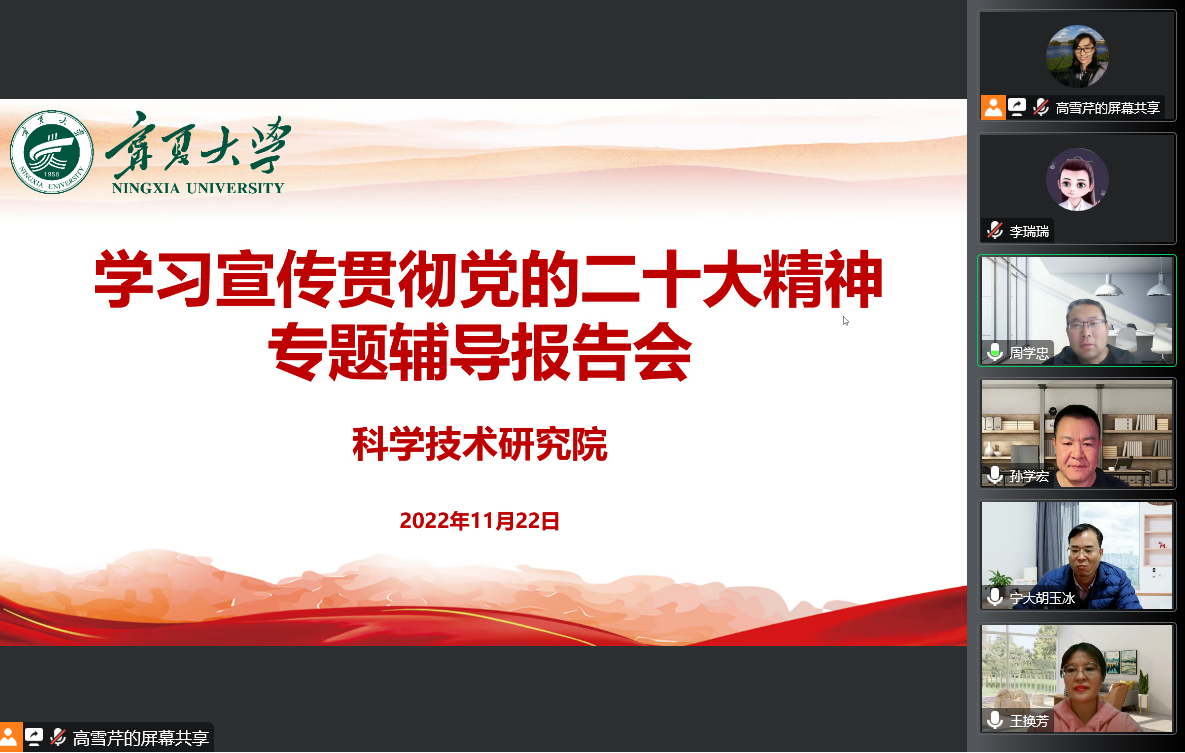 【beat365唯一官方网站新闻中心讯 科学技术研究院】为深入学习宣传贯彻党的二十大精神,11月22日,科学技术研究院党支部召开线上会议,专题学习党的二十大精神,邀请人事处(党委教师工作部)副处长(副部长)王换芳教授作专题辅导报告,全体教职工线上参加会议。