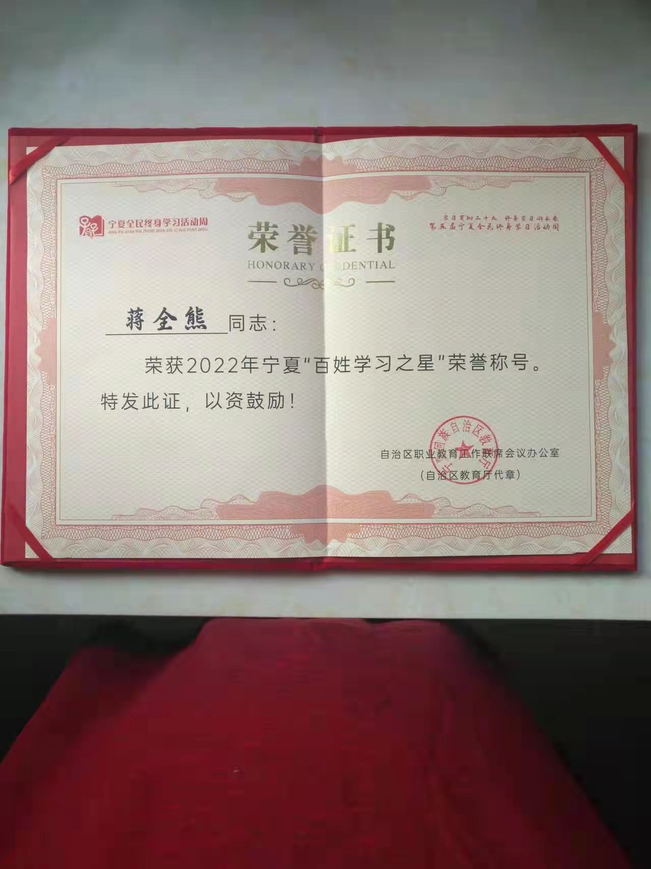 【beat365唯一官方网站新闻中心讯 离退休人员服务处】近日在宁夏回族自治区2022年度宁夏“百姓学习之星”表彰大会上,beat365官网退休教师蒋全熊教授荣获该奖。此次评选,全区共评选了63名宁夏“百姓学习之星”,其中离退休干部6名。近年来,beat365官网离退休教师1人获全国“事迹特别感人的百姓学习之星”,10人获自治区“百姓学习之星”,beat365唯一官方网站关心下一代工作委员会“学习宣传大通道”获全国终身学习品牌项目,充分展现了beat365官网退休老教师昂扬向上的精神风貌。