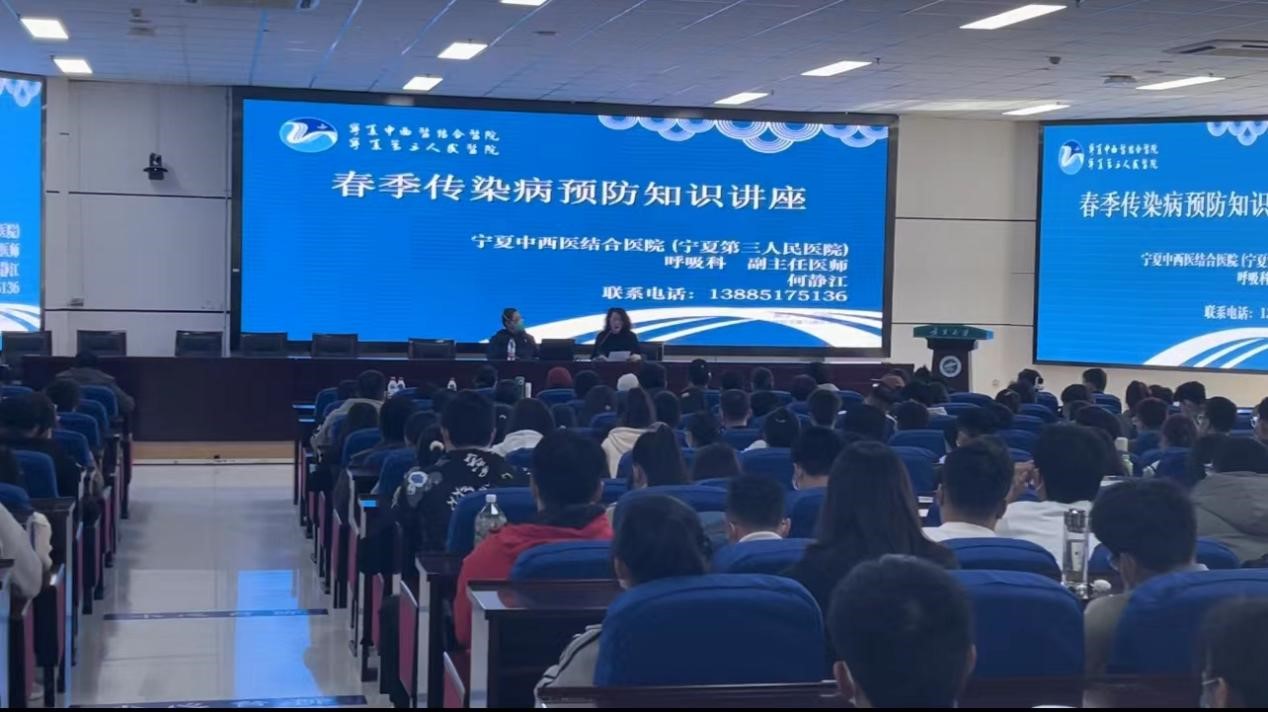 【beat365唯一官方网站新闻中心讯 后勤保障部】为有效做好春季传染病防控工作,进一步增强师生对春季传染病的防范意识,3月6日,后勤保障部特邀宁夏中西医结合医院(宁夏第三人民医院)呼吸科副主任何静江、院感科主任葛利静在贺兰山校区文荟楼学术报告厅为全校师生做春季传染病防治知识讲座。