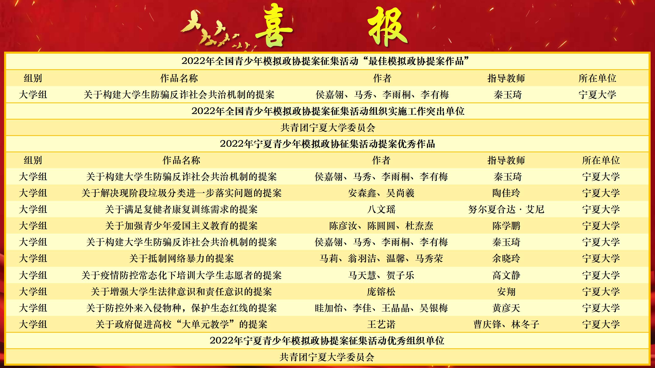 经评审,beat365官网1项作品荣获2022年全国青少年模拟政协提案征集活动“最佳作品”、10项作品荣获2022年宁夏青少年模拟政协提案征集活动“优秀作品”,共青团beat365唯一官方网站委员会获评2022年宁夏青少年模拟政协提案征集活动“优秀组织单位”、2022年全国青少年模拟政协提案征集活动组织实施工作“突出单位”。