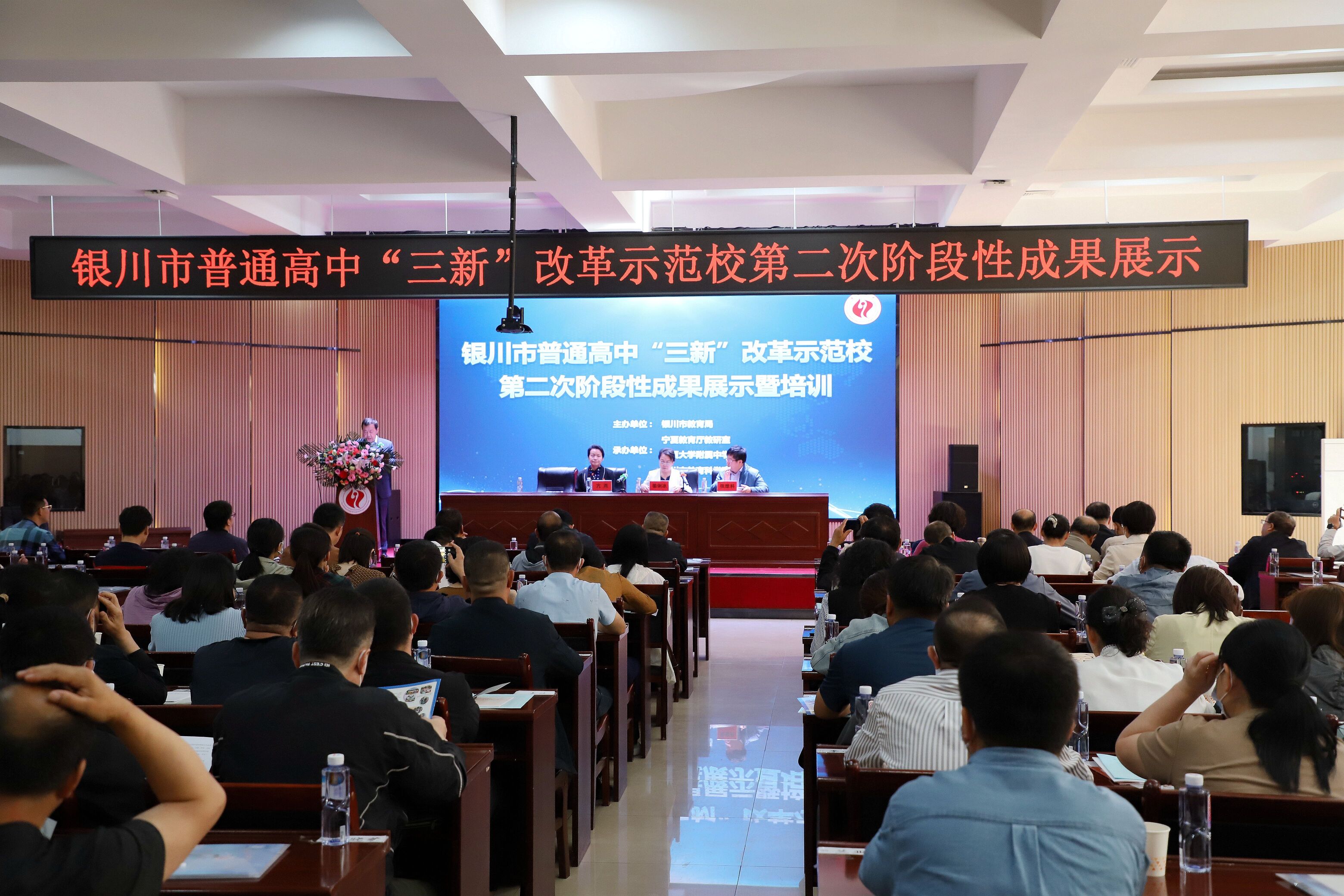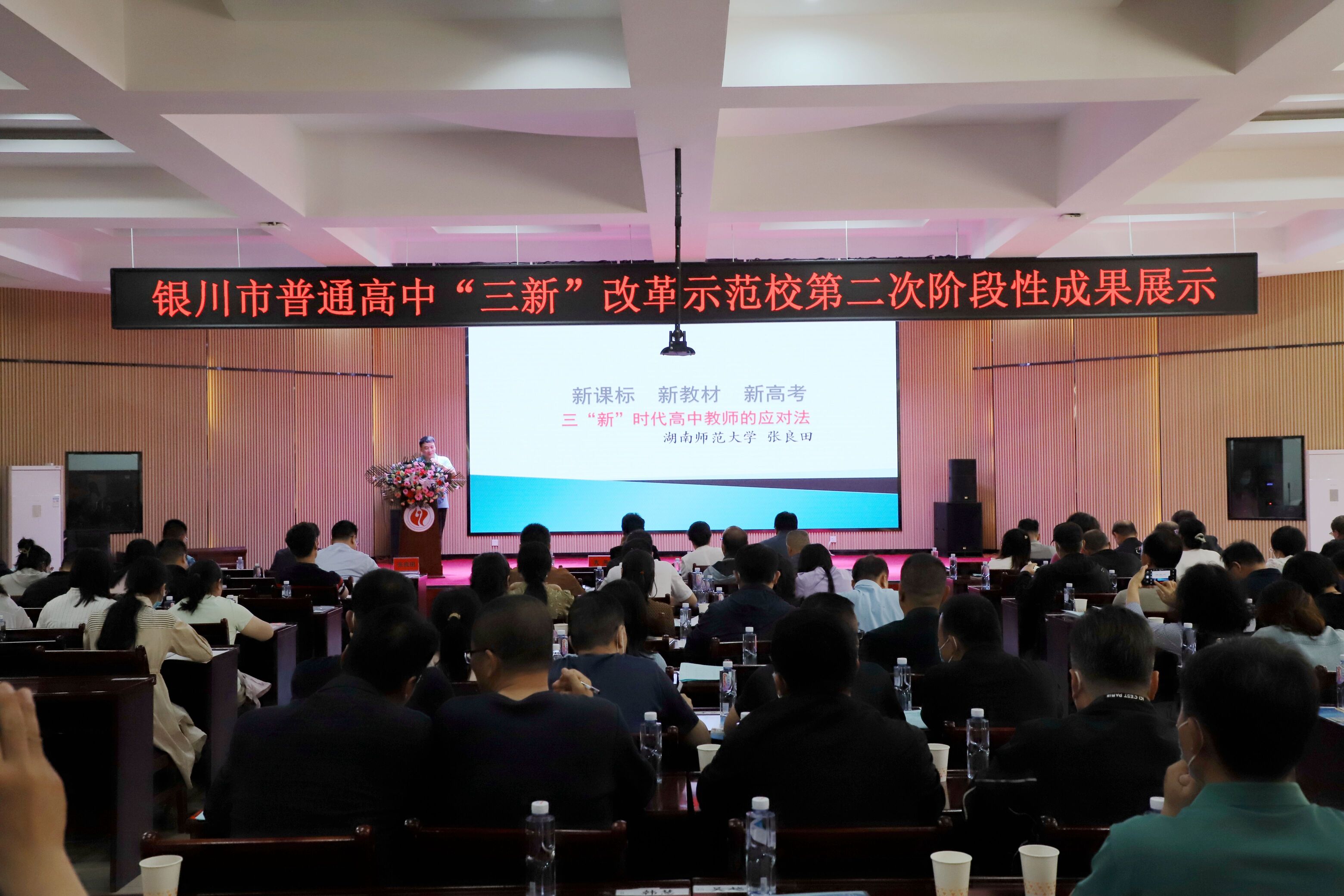 【beat365唯一官方网站新闻中心讯 附属中学/文 姬晓姗 /图】为贯彻落实党的二十大精神,全面落实立德树人根本任务,发挥示范校建设的示范引领、辐射带动作用,搭建校际间相互促进、共同成长的交流平台,推动银川市新课程新教材实施水平的整体提升,5月30日,银川市普通高中“三新”改革示范校第二次阶段性成果展示暨培训活动在beat365官网附属中学举办。银川市教育局副局长姜俐冰、银川市教科所所长张维科、各县(市)区教(体)育局负责同志,各县(市)区教研室(教师发展中心)负责人及高中教研员、银川市辖区各公、民办普通高中学校校长或分管副校长以及教务主任、年级组长、教研组长、备课组长等200余名领导嘉宾出席开幕式,附属中学副校长王永峰主持开幕式。