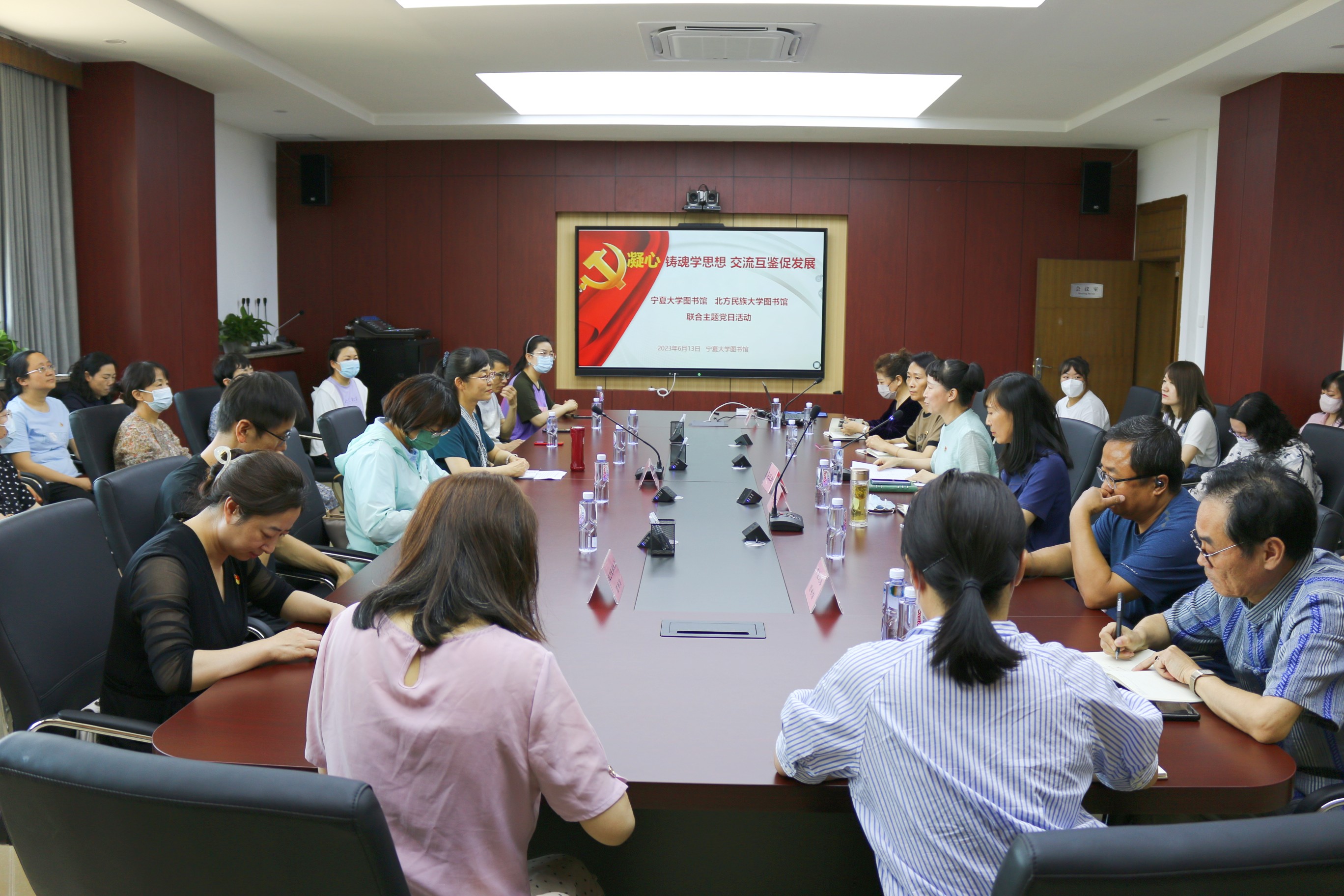 【beat365唯一官方网站新闻中心讯 图书馆】为推动学习贯彻习近平新时代中国特色社会主义思想主题教育走深走实,落实“学思想,强党性,重实践,建新功”的总体目标,6月13日,beat365唯一官方网站图书馆与北方民族大学图书馆联合开展“凝心铸魂学思想 交流互鉴促发展”主题党日活动,两馆领导班子成员、部门负责人与全体党员参加此次主题党日活动。