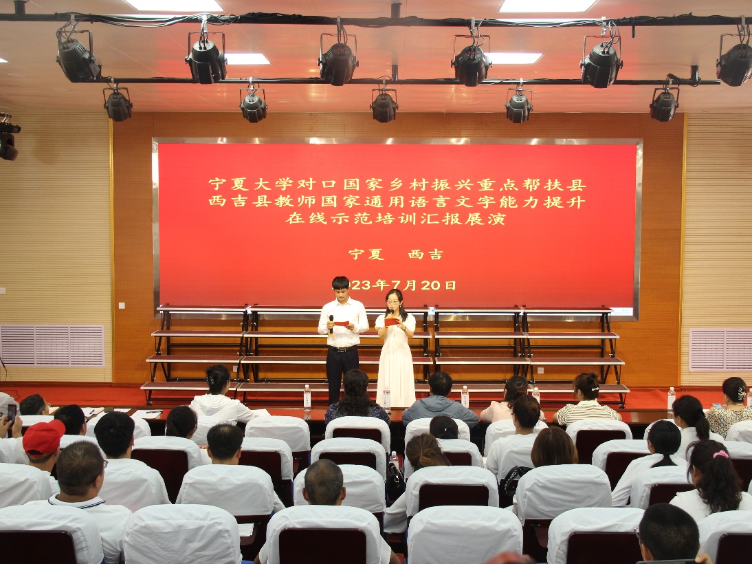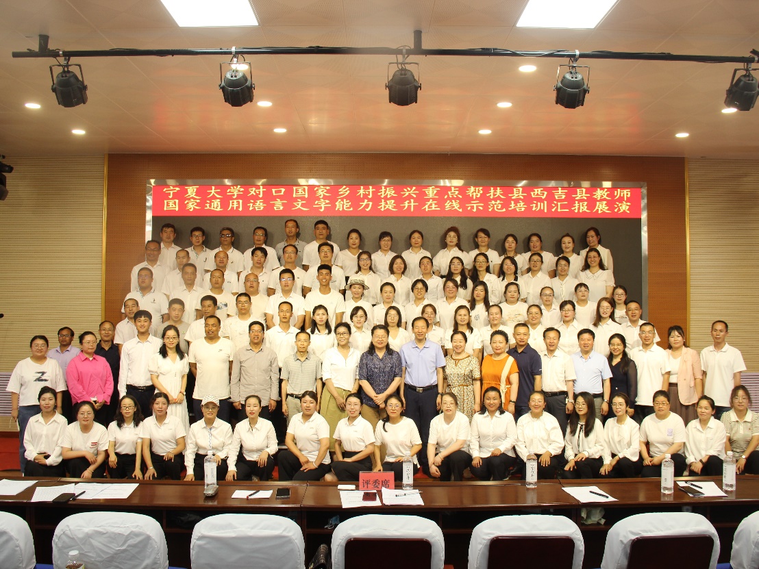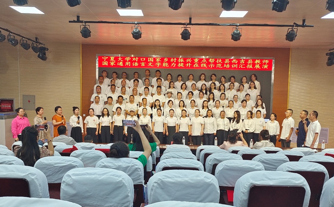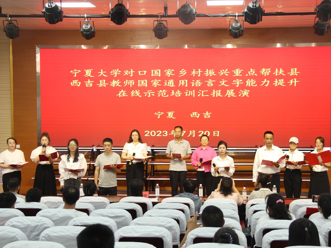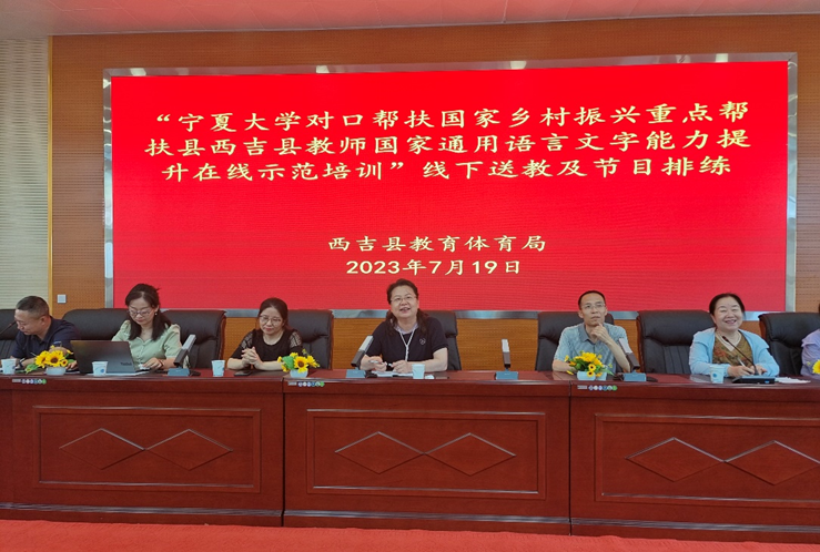 培训教师团队由18位专家教师和12名助教共30人组成,来自西吉县的103位中小学教师作为受训学员参加了培训。专家教师团队阵容强大,培训内容分线上、线下两大板块,线上培训包括普通话发音、课堂教学语言、中华优秀传统文化、中华民族共同体意识等内容,授课达到66课时。7月18日,线上培训全部结束。7月19日,培训团队赴西吉县开展线下送教活动,内容包括培训团队与学员座谈、专家教师面对面指导发音训练和答疑、专家教师指导排练朗诵节目等。