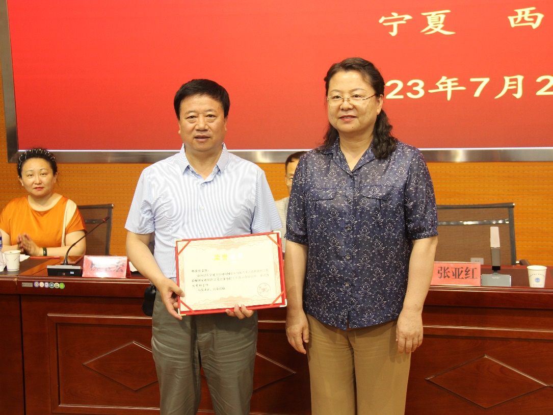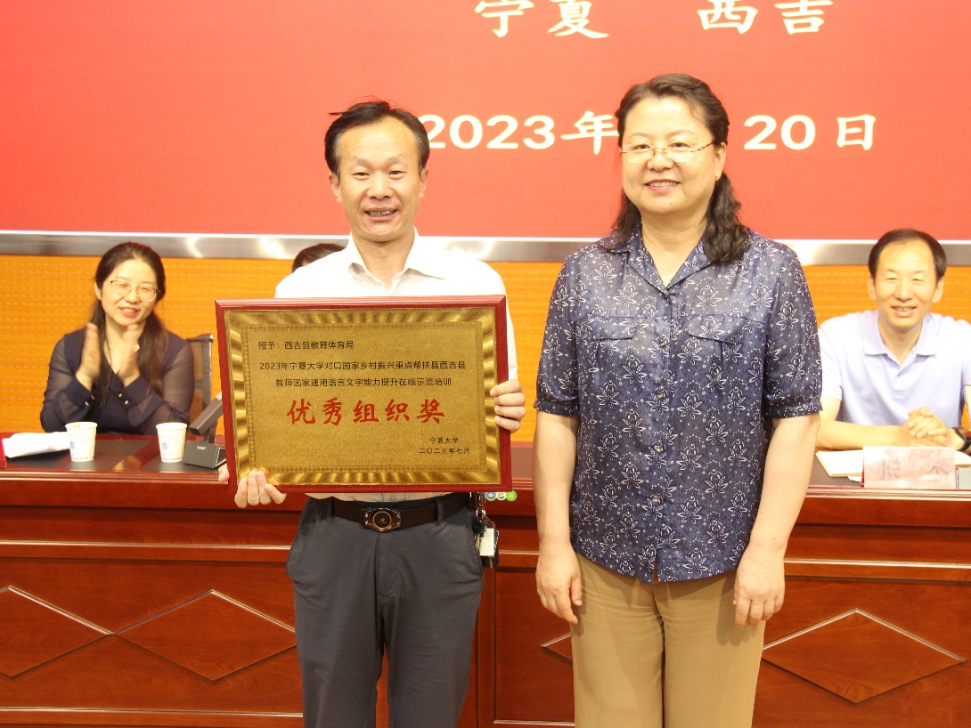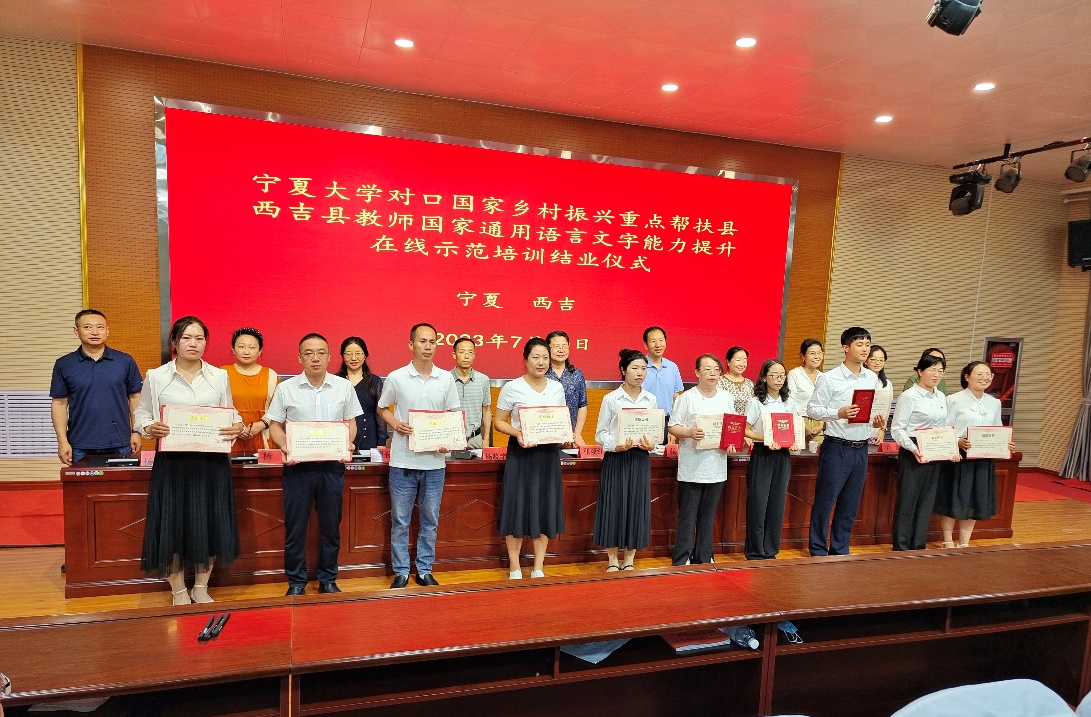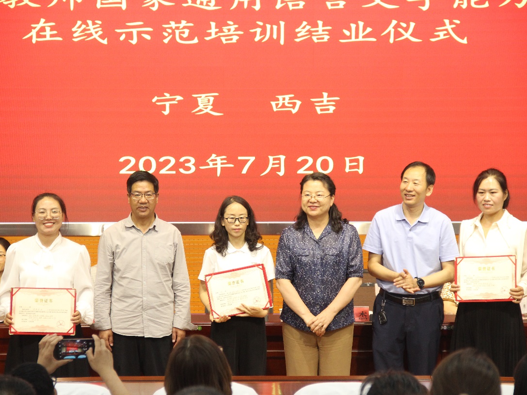 beat365唯一官方网站本科生院院长、国家语言文字推广基地主任张亚红和西吉县教育体育局副局长张杰出席结业仪式并讲话。beat365唯一官方网站培训团队专家代表马明艳和西吉县培训学员代表李娟丽分别作了发言。仪式上还宣读了《关于培训班学员结业的决定》《关于表彰优秀个人和集体的决定》,与会领导为学员颁发了结业证书,为获奖个人和集体颁发了荣誉证书和奖牌。
