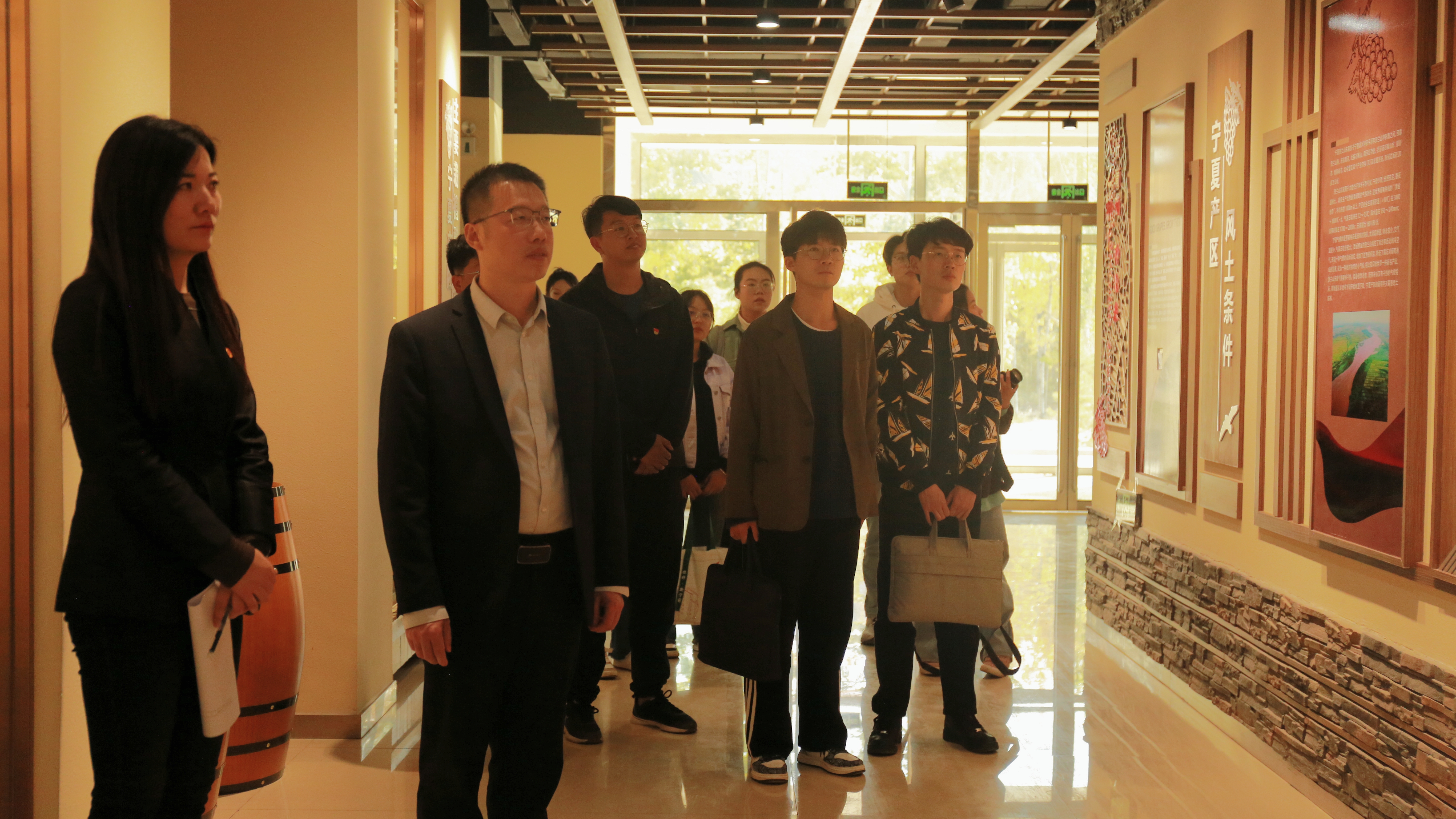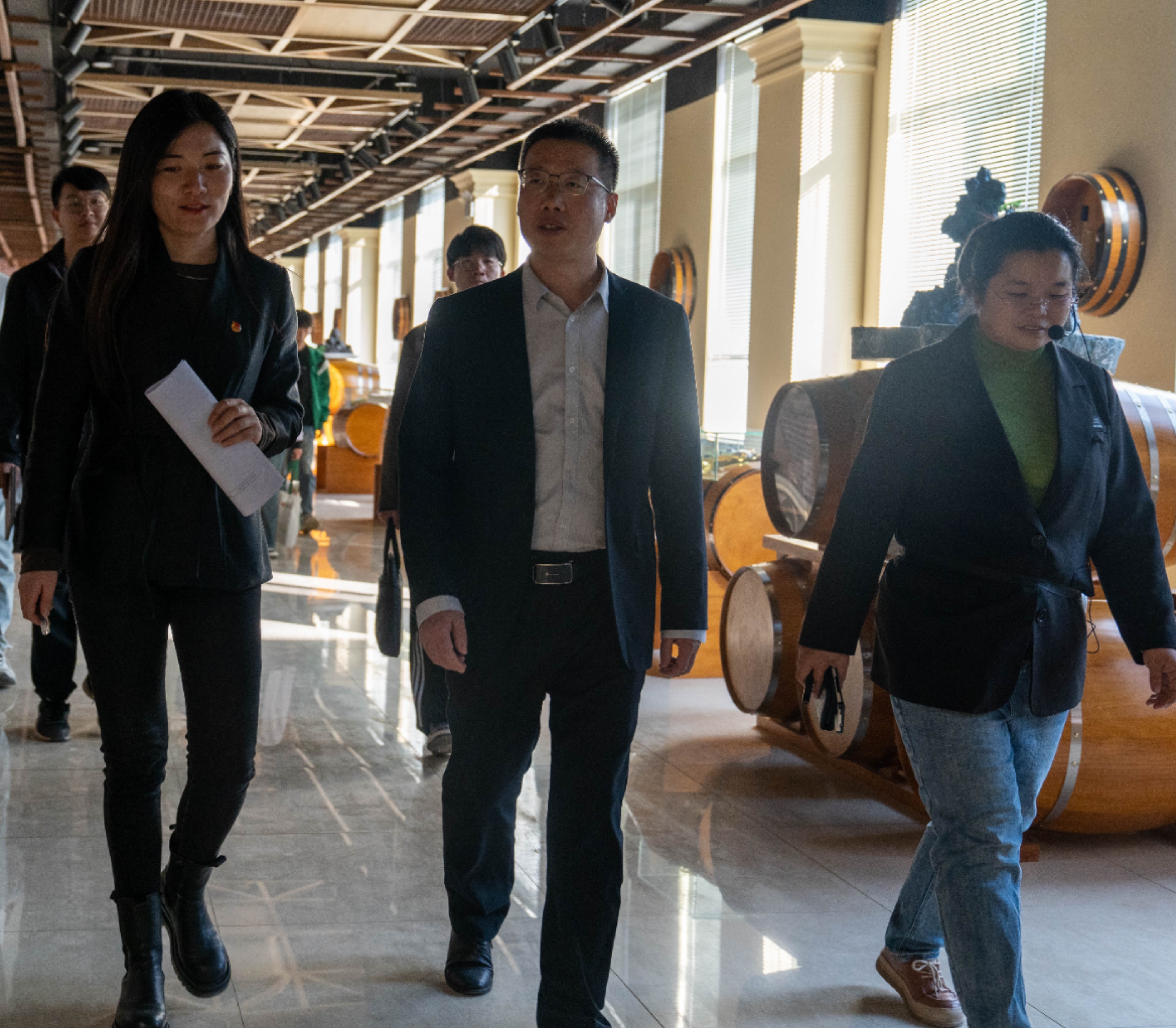 肖功国一行参观了宁夏葡萄酒与防沙治沙职业技术学院葡萄酒酿造生产实训中心,围绕“产、学、研、训”和社会服务功能,深入了解葡萄与葡萄酒相关专业在教学、实训、培训、技能鉴定、技能竞赛、科研等方面的发展历程。