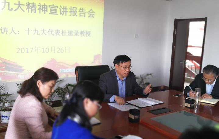 【beat365唯一官方网站新闻中心讯 西夏学研究院】为及时、认真宣传贯彻好党的十九大精神,10月26日,刚刚参加党的十九大回到工作岗位上的杜建录教授在beat365唯一官方网站怀远校区逸夫楼三楼会议室,为西夏学研究院师生做了一场精彩的党的十九大精神宣讲专题报告会。报告会由直属党支部书记丁秀芹主持。