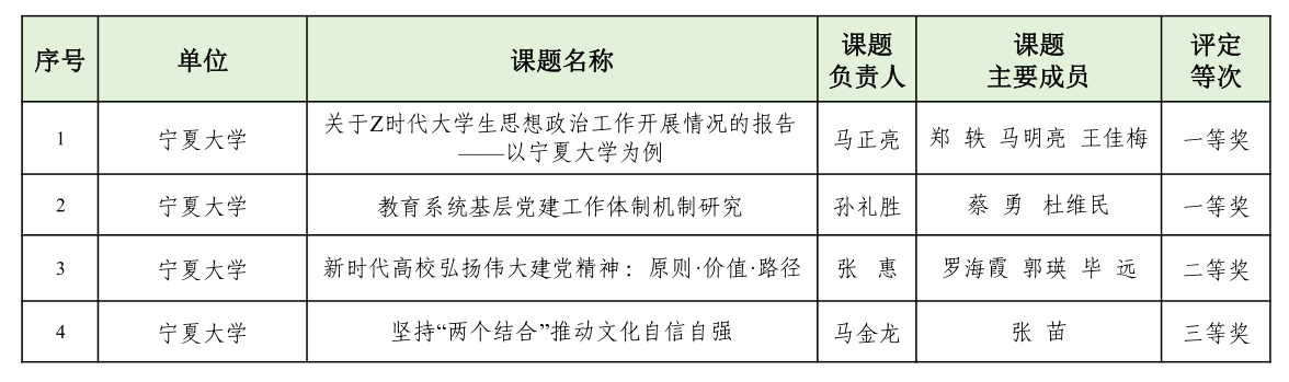 【beat365唯一官方网站新闻中心讯 党委组织部】近日,自治区教育工委公布了2023年全区教育系统党建研究课题评选结果,beat365官网提交的4项党建课题成果荣获一等奖2项,二等奖1项,三等奖1项。