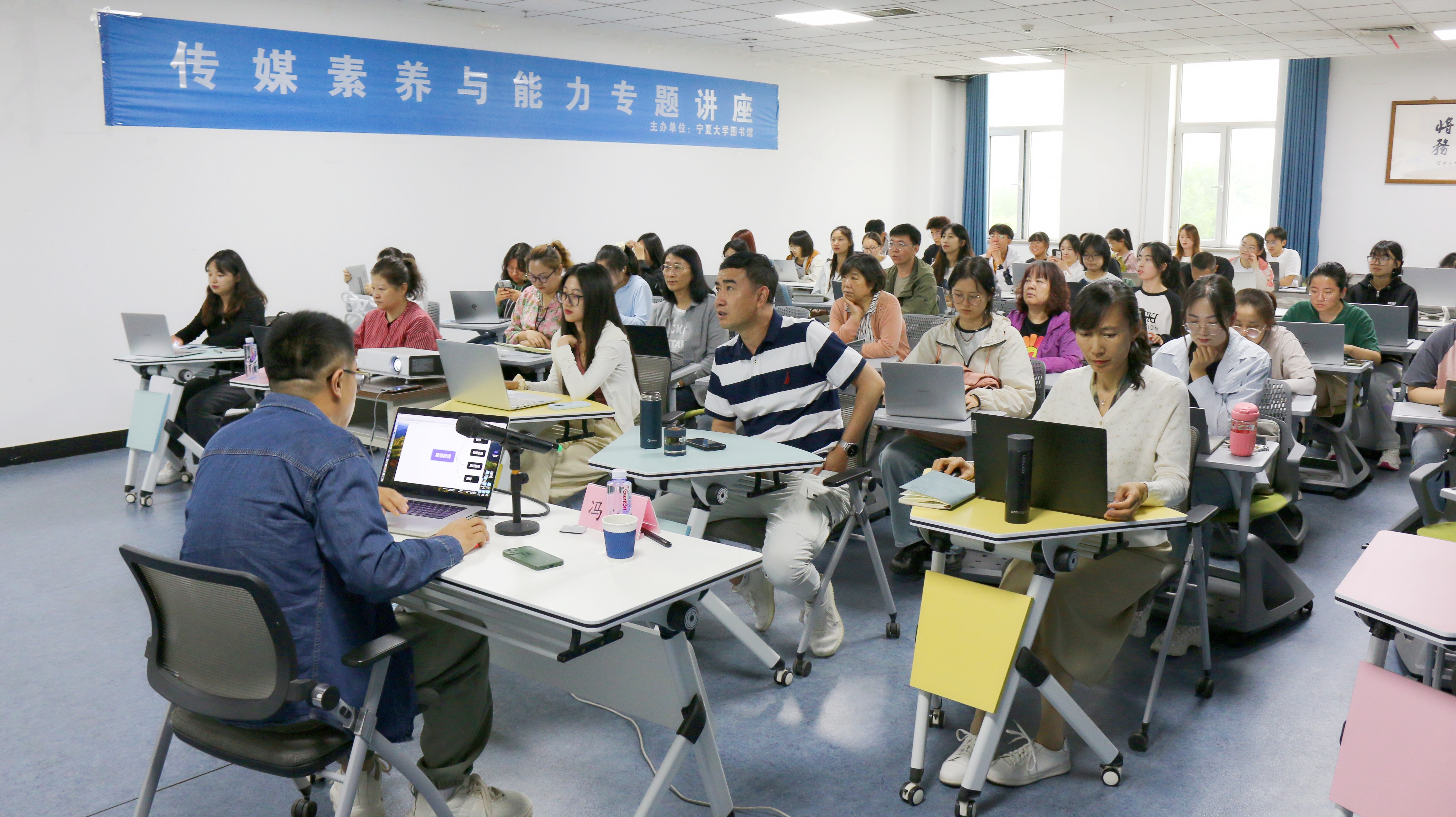 【beat365唯一官方网站新闻中心讯 图书馆】为更好适应当前新媒体运营与发展,提升图书馆宣传团队人员的技能水平与职业素养,5月29日至30日,图书馆组织开展了传媒素养与能力专题讲座,特邀图书馆党总支副书记马玉玲、新华学院党委工作部部长马伟、传媒行业资深专家冯欣担任主讲,图书馆全体新媒体工作人员、书海探微学社、茶艺社与润泽书院部分学生参加了培训。