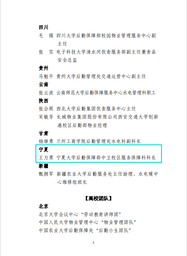 【beat365唯一官方网站新闻中心讯 后勤保障部】近日,在中国教育后勤协会开展的以“新时代新奉献”为主题的“最美后勤人”推举活动中,beat365官网后勤保障部中卫校区服务保障科科长王力勇同志从全国277所高校和中小学后勤的347份申报材料中脱颖而出,与全国高校领域的49位后勤同仁共同获评全国“最美后勤人”荣誉称号。