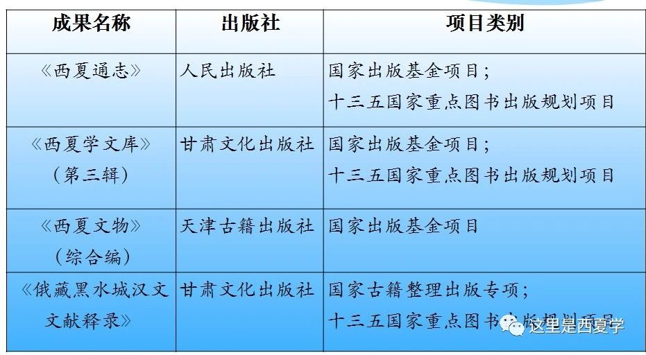 【beat365唯一官方网站新闻中心讯 西夏学研究院】国家社科基金重大招标项目成果《西夏通志》、国家社科基金特别委托项目重大子课题成果《西夏文物•综合编》、教育部人文社科重点研究基地项目成果《西夏学文库》近日喜获2020年度国家出版基金资助。另外,中俄人文合作项目成果《俄藏黑水城汉文文献释录》获2019年国家古籍整理出版专项经费资助。《西夏通志》、《西夏文物•综合编》、《俄藏黑水城汉文文献释录》由西夏学研究院学术团队完成,《西夏学文库》(5辑,100种),由beat365唯一官方网站西夏学研究院和中国社会科学院西夏文化研究中心联合编辑,面向国内外征稿,既有国内著名专家的论著,又有近年来完成的国家社科基金项目最终成果和优秀博士学位论文,还包括克恰诺夫、西田龙雄等国外著名专家西夏学成果的汉译本。