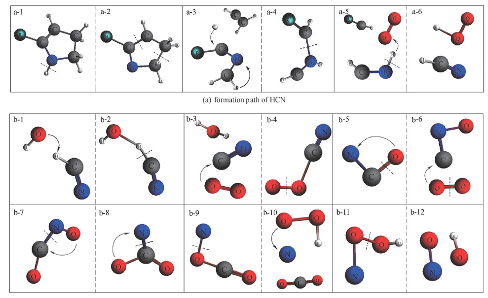 当前煤炭资源高效清洁利用面临严峻的环境挑战。揭示煤的不同热化学转化过程中污染物释放和迁移转化对于污染减排至关重要。“煤炭清洁利用”创新研发团队采用先进的反应分子动力学模拟方法,研究了燃煤过程中含氧官能团和吡啶/吡咯型氮化物的转化机理,建立了有机氮和COx的转化和生成路径,获得了HCN、NO和NO2等关键物种的演变过程(论文1和6)。