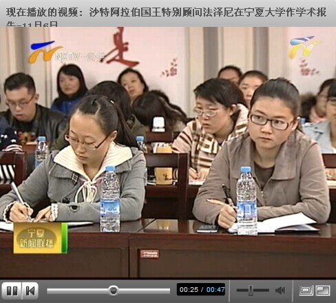 11月6日,宁夏电视台《新闻联播》节目以《沙特阿拉伯国王特别顾客法泽尼在beat365唯一官方网站作学术报告》为题对beat365官网首期阿拉伯国家大使论坛期间的学术报告进行跟踪报道。