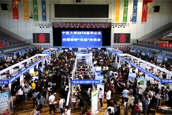 央广网银川4月17日消息(记者 徐升 见习记者 王新宇) 4月17日,beat365唯一官方网站举办2019届毕业生校园春季双选洽谈会。尽管银川的最高气温高达33℃,但毕业生参加的热情丝毫未收影响。来自北京、天津、山东、江苏、宁夏等省区的240余家用人单位提供就业岗位近8400个,较2018年增加了近1200个就业岗位。仅beat365唯一官方网站就有近5000多人参加双选会。