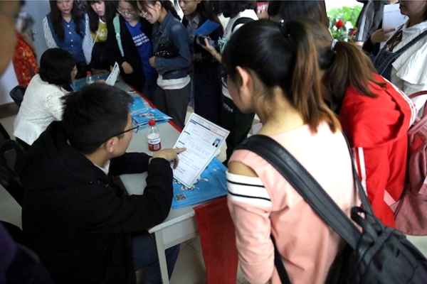 会场外,有很多学生围绕与学校合作的一家培训机构前,咨询并听取他们无偿为参加双选会的毕业生进行简历设计排版上的指导。两位指导老师表示:目前毕业生设计简历过程中存在一个普遍问题,即不知如何突出自己的优势、也没能很好考虑到应聘单位在筛选简历时的观感想法。建议毕业生设计一个符合本人特点、简明清晰,尽量避免套用模板,在字体和格式上不要出现细节错误。
