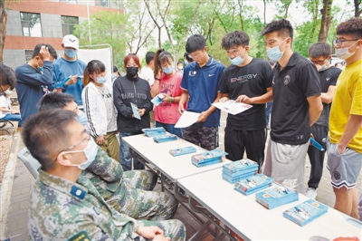银川市西夏区征兵咨询点聚集了不少男生,了解大学生参军入伍优待政策。