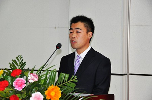 学生代表张志博在学雷锋精神主题演讲会上演讲。