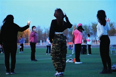 三五好友相约操场一起唱歌。马蕊/摄