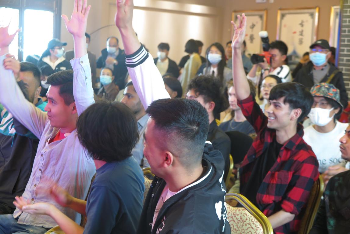秦腔折子戏《天女散花》表演结束后,表演者现场邀请观众上台模仿,来自巴基斯坦的泽如(Manzar)主动上台学习。他照着老师的示意动作,有模有样地挥起彩绸水袖,口中喊道“老师,我可以做到!”