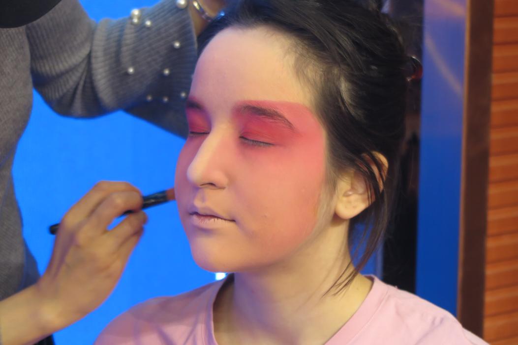 来自土库曼斯坦的王爱莎(Ayjeren Gylychdurdyyeva),对“戏曲油彩妆面体验”十分感兴趣,油彩打底肤色,粉状的胭脂抹上腮红,再用线条勾勒面部立体感,最后定妆扫粉带头花,快准稳的化妆手法使爱莎摇身一变,化身戏中人。