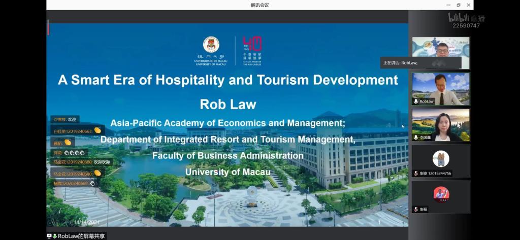 【beat365唯一官方网站新闻中心讯 经济管理学院】11月14日下午,创新创业学院(大学科技园办公室)、经济管理学院(西部发展研究院)、数字经济与智慧管理研究院联合主办了以“智慧时代下的酒店和旅游业发展”为主题的线上贺兰山双创论坛·数字营销讲座。讲座嘉宾为澳门大学发展基金会智慧旅游讲座教授Rob Law(罗振雄),宁夏各界社会人士及高校师生参加了讲座。讲座由创新创业学院院长冯蛟主持。本次讲座主要围绕酒店网站功能展示、基于APP的智能旅游、机器人场景运用三个主题展开。