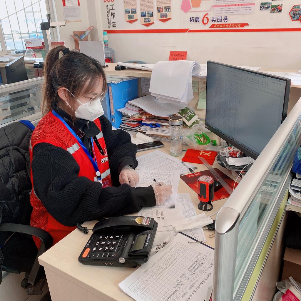 2018级学前教育专业申晓婷,11月14日早上解除居家隔离后第一时间就申请加入到了所在社区的疫情防控工作之中,主要负责在设立的卡点上监测小区人员的出入,为他们测量体温并进行登记,为还在居家监测的人员运送物资,同时还提醒居民要戴好口罩,普及疫情期间需要注意的事项。这份志愿服务工作每天需要在户外卡点坚守七八个小时,寒冷的天气给她的工作增加了不少挑战。每隔一个小时她必须来回踱步一会,活动一下僵硬的身体,也给自己增加一些温度。这样的志愿服务工作她每天坚持。