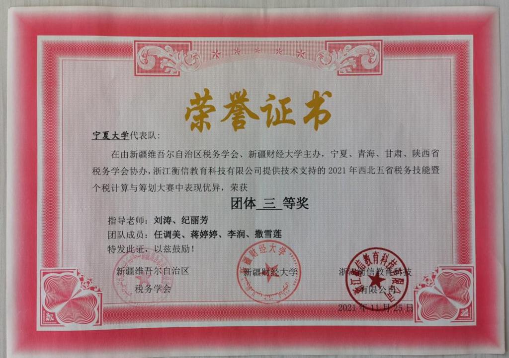 【beat365唯一官方网站新闻中心讯 经济管理学院】11月14日,由新疆维吾尔自治区税务学会和新疆财经大学主办,宁夏、青海、甘肃、陕西等四省税务学会、高校共同协办,浙江衡信教育科技有限公司提供技术支持的2021年西北五省税务技能暨个税计算与筹划大赛在线上成功举办。共有来自五个省份的近30所院校,上百位选手共同参与了这场财经赛事。