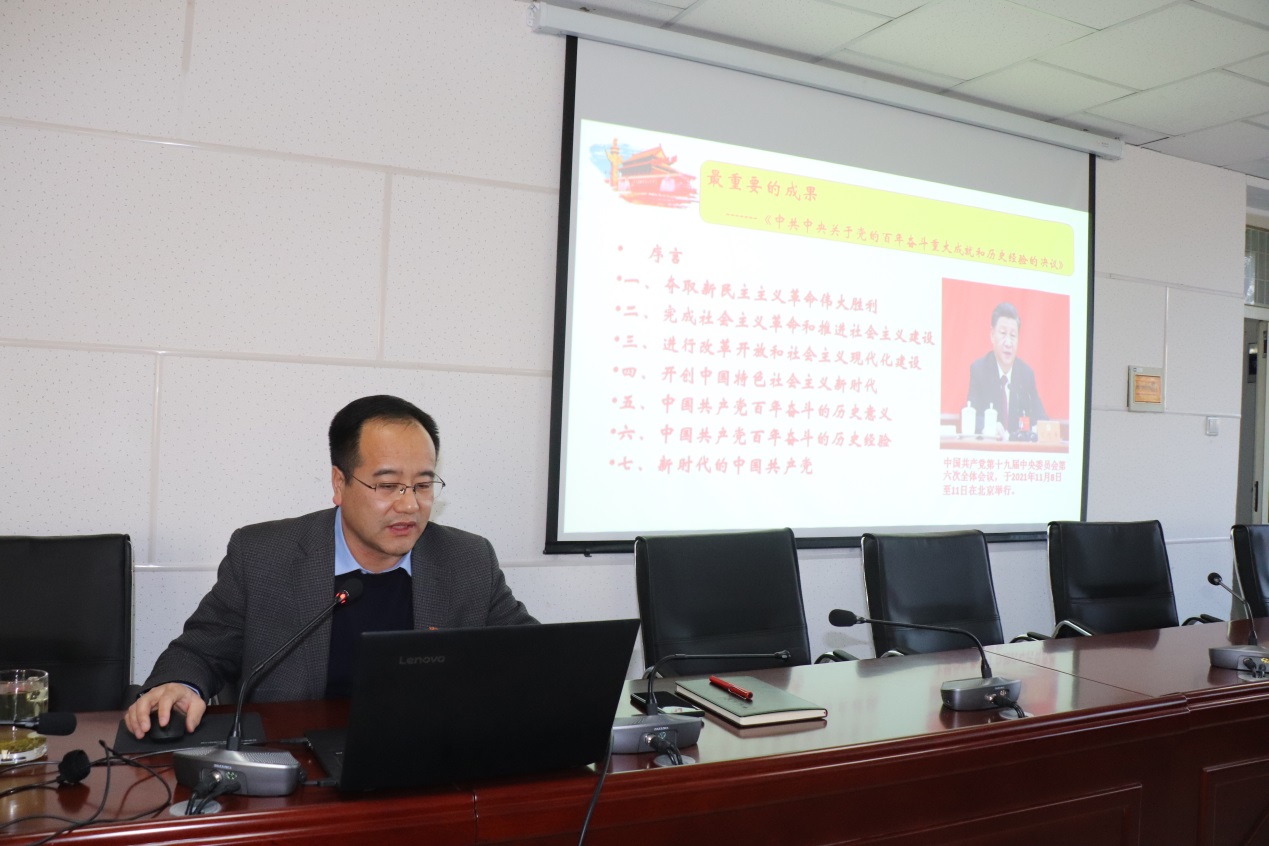 马瑜、王旭明、郭中华、任克亮、刘剑分别为电气与自动化系、物理系、信息工程系、两个实验中心以及“三办”的教职工们,深入浅出从历史背景与时间节点、中国共产党百年奋斗的历史意义、百年奋斗的十条经验、与前两个历史决议的异同点等方面紧紧围绕党的十九届六中全会精神进行解读。宣讲强调党的十九届六中全会是一次具有里程碑意义的重要会议,会议通过的《中共中央关于党的百年奋斗重大成就和历史经验的决议》是一篇马克思主义的纲领性文献,是新时代中国共产党人的政治宣言,是实现中华民族伟大复兴的行动纲领。