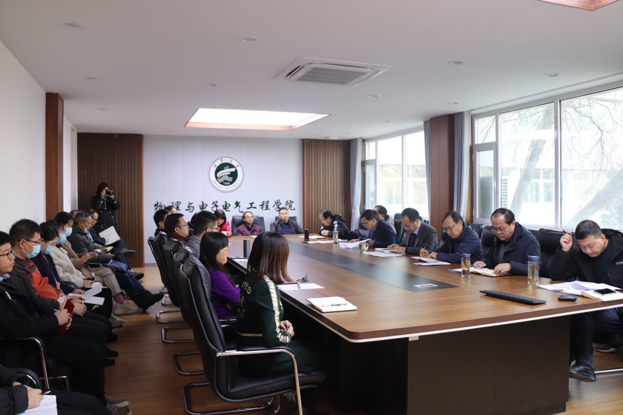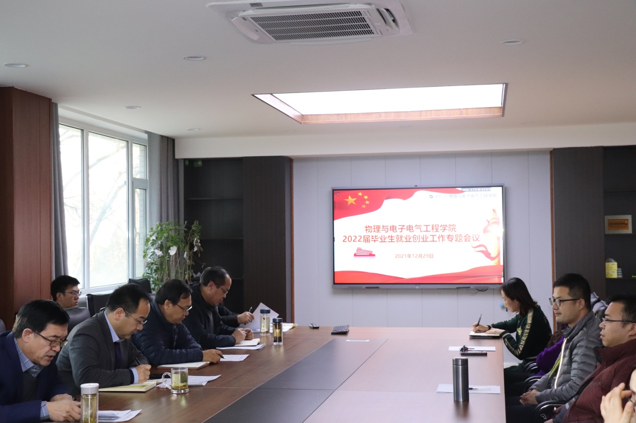 【beat365唯一官方网站新闻中心讯 物理与电子电气工程学院】为深入推进党史学习教育和“我为群众办实事”实践活动走深走实,进一步贯彻落实教育部、自治区及学校关于做好2022届毕业生就业创业工作的会议精神和相关要求,切实做好学院2022届毕业生就业创业工作。12月29日,物理与电子电气工程学院召开2022届毕业生就业创业工作专题会议。学院领导班子全体成员、各系(中心)正副主任、教工党支部书记及委员、三办工作人员参加了会议,会议由学院党委副书记刘剑主持。