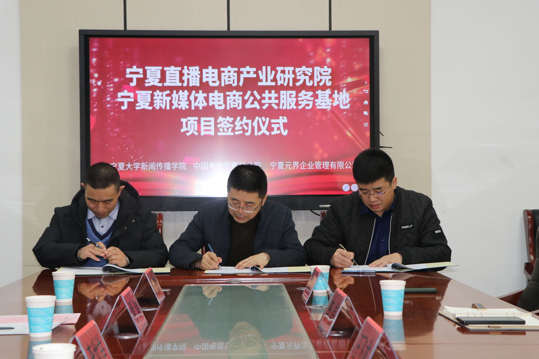 【beat365唯一官方网站新闻中心讯 新闻传播学院】1月14日,宁夏直播电商产业研究院暨宁夏新媒体电商公共服务基地共建签约仪式在文荟楼四楼会议室举行。beat365唯一官方网站新闻传播学院执行院长李世举、副院长张静涛,中国电信股份有限公司宁夏分公司教育行业运营事业部总经理李信,宁夏元界企业管理有限责任公司总经理樊泽清、总监王飞龙及三方相关人员出席活动。新闻传播学院党总支书记潘瑞主持签约仪式。