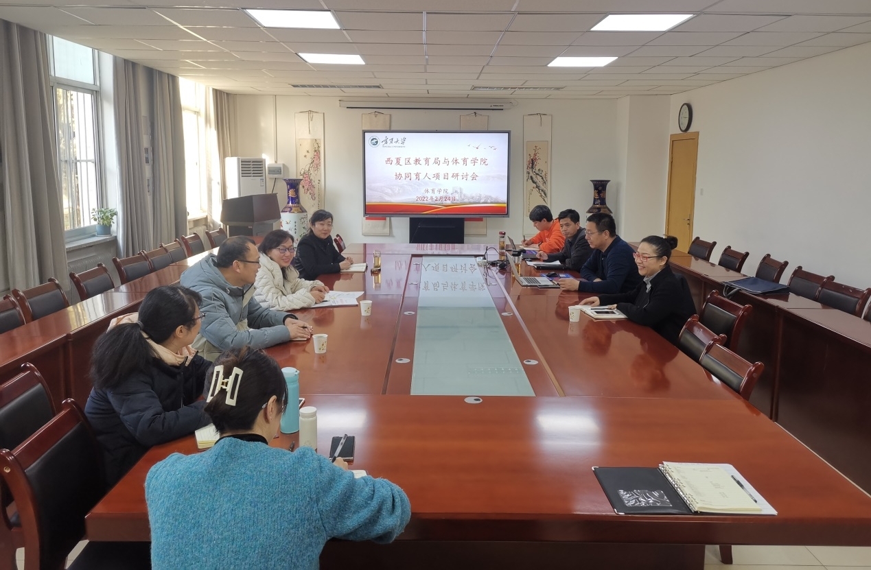 【beat365唯一官方网站新闻中心讯 体育学院】为贯彻落实“双减”政策,进一步加强学生教育实习工作,切实提高地方人才培养质量,构建地方政府、高等学校、中小学“三位一体”协同育人体系,2月24日上午,体育学院与西夏区教育局开展协同育人项目研讨会,学院部分领导班子成员、西夏区教育局基础教育办公室主任田秀萍及西夏区体育教研员刘心同出席本次研讨会,会议由院长咸云龙主持。