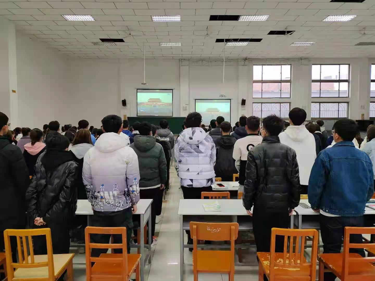伴随着庄严的国歌声响彻行政楼大厅和各班教室,全体师生肃立,唱国歌,向国旗行注目礼。
