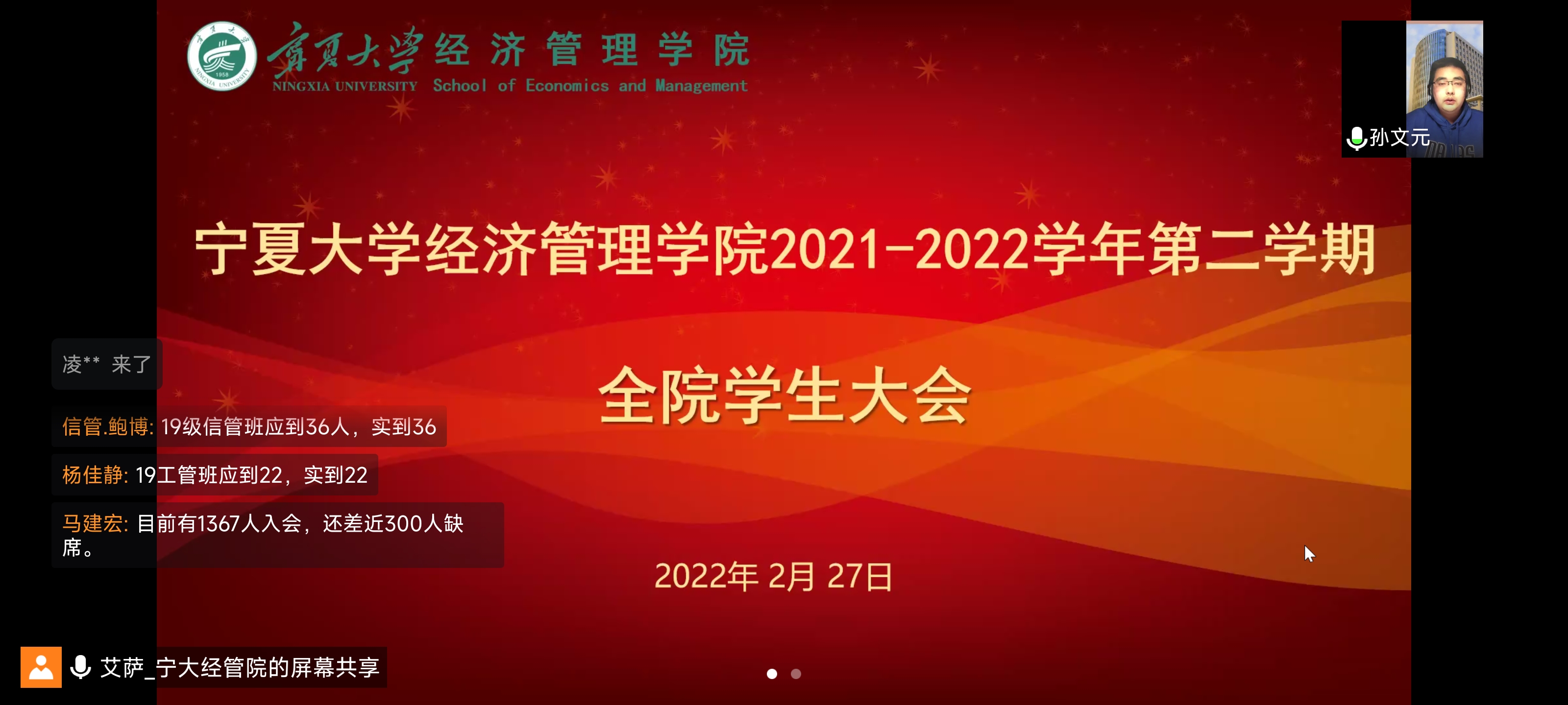 【beat365唯一官方网站新闻中心讯 经济管理学院】2月27日晚,经济管理学院在线上举行了年级大会。学院党委副书记马建宏,学院学生工作办公室主任黄旭兴,学院研究生辅导员郭飞、杨波,学院本科生辅导员艾萨·阿尤普、孙文元、禹文杰出席本次会议。经济管理学院全体学生参加本次会议。本次会议由艾萨·阿尤普主持。