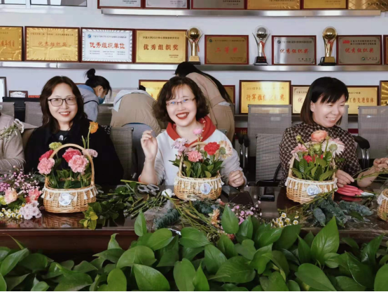 此次活动邀请了拥有多年插花经验的花艺老师给大家详细讲解了花材的识别、色彩的搭配、插花特点等方面的相关知识,并现场进行了插花展示。在花艺老师的精心指导下,一盆盆错落有致、生机盎然的插花作品展现在了大家眼前,看着自己双手制作的插花作品,大家脸上洋溢出喜悦的笑容,与鲜花合影,与温馨拥抱。