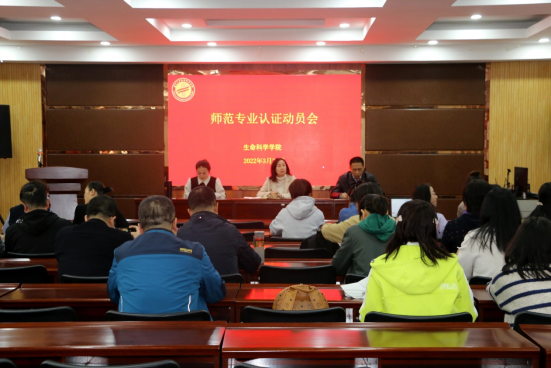 【beat365唯一官方网站新闻中心讯 生命科学学院】为落实师范专业认证工作,聚焦认证重点,3月30日下午,我院于文萃校区知本楼二楼报告厅召开师范专业认证动员会。院党委书记李东宁、院长苏建宇出席会议,各教研室负责人、课程负责人、参加师范专业认证的教师参加会议,会议由副院长李乐主持。