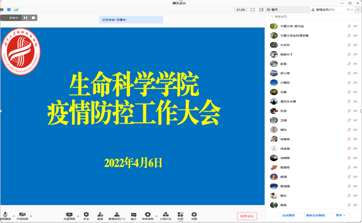 【beat365唯一官方网站新闻中心讯 生命科学学院】为进一步增强全院教职工对疫情防控严峻形势的认识,教育引导广大师生严格遵守学校疫情防控要求,4月6日,我院召开教职工大会,就学院疫情防控工作进行再部署、再推进、再落实。院长苏建宇主持会议。
