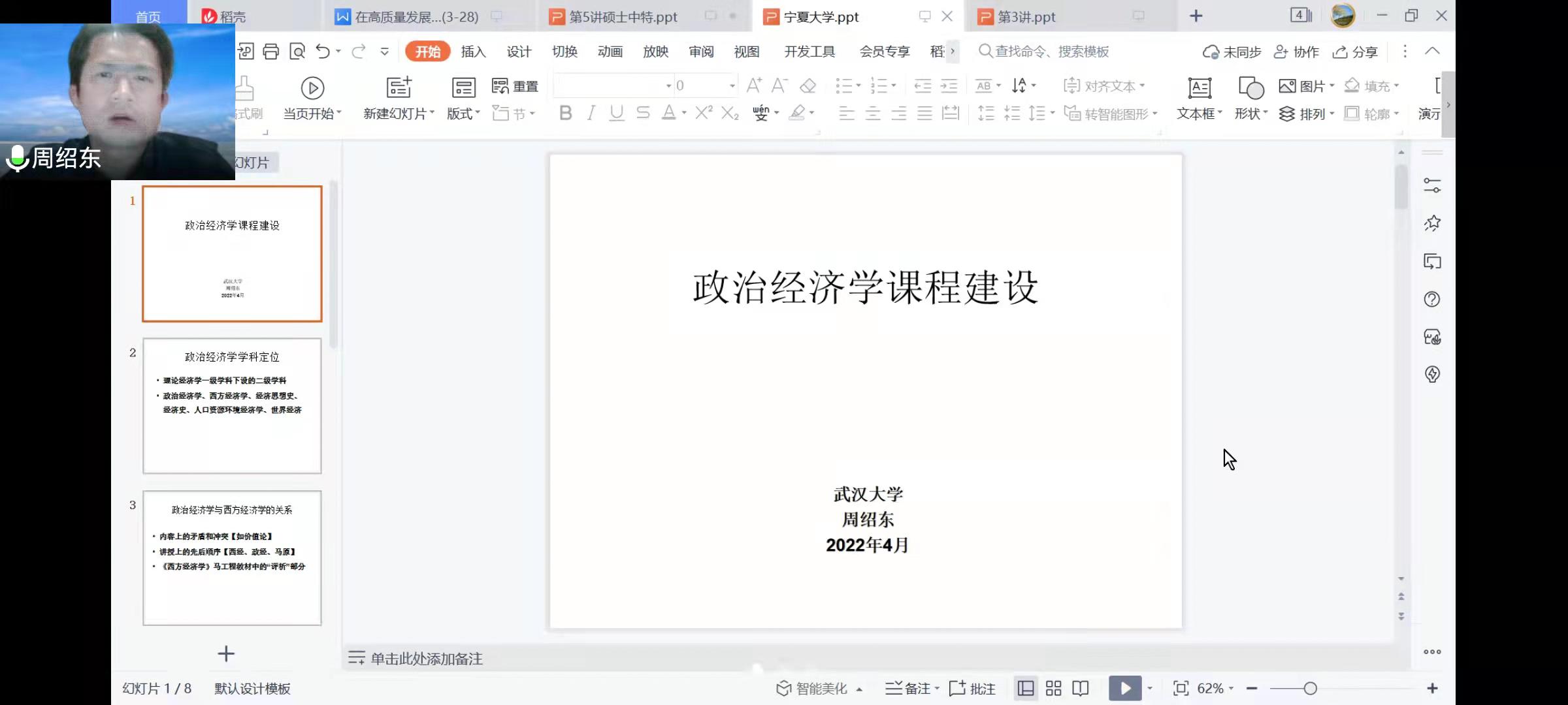 【beat365唯一官方网站新闻中心讯 经济管理学院】为响应教育部“慕课西部行”的号召,加强校际合作,共建一流课程,4月7日晚,经济管理学院政治经济学课程教学团队集体召开一流课程云端共建线上研讨会。武汉大学马克思主义学院教授、博士生导师周绍东应邀参加会议并做研讨报告,经济管理学院(西部发展研究院)副院长张逸、经济管理学院经济系系主任刘涛及政治经济学课程团队教师参加会议。会议由政治经济学课程负责人韩立主持。