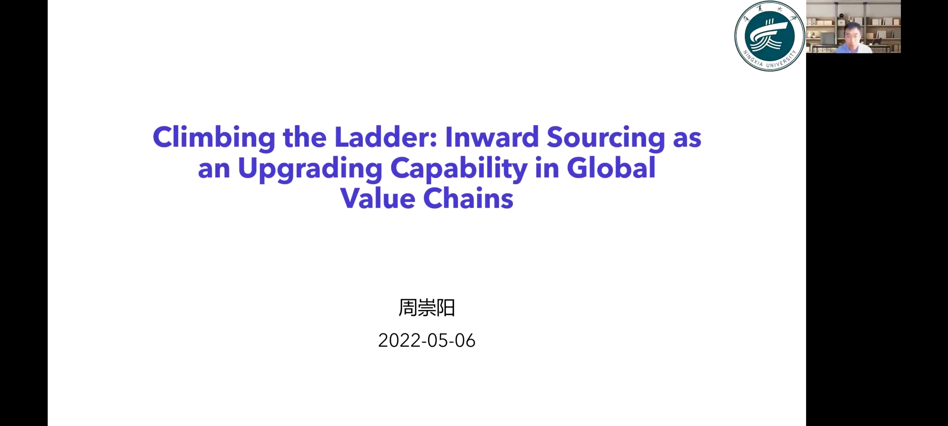 【beat365唯一官方网站新闻中心讯 经济管理学院】 5月6日晚,经济管理学院2022年第四期塞上经济·青年学术论坛讲座以线上会议的方式顺利举行。经济管理学院诚邀香港城市大学博士、美国麻省大学洛威尔分校访问学者周崇阳分享其最新学术成果《登上阶梯:内向采购作为一种全球价值链中的技术升级能力》。本次会议由我院教师郭飞主持,宁大师生共同参与。